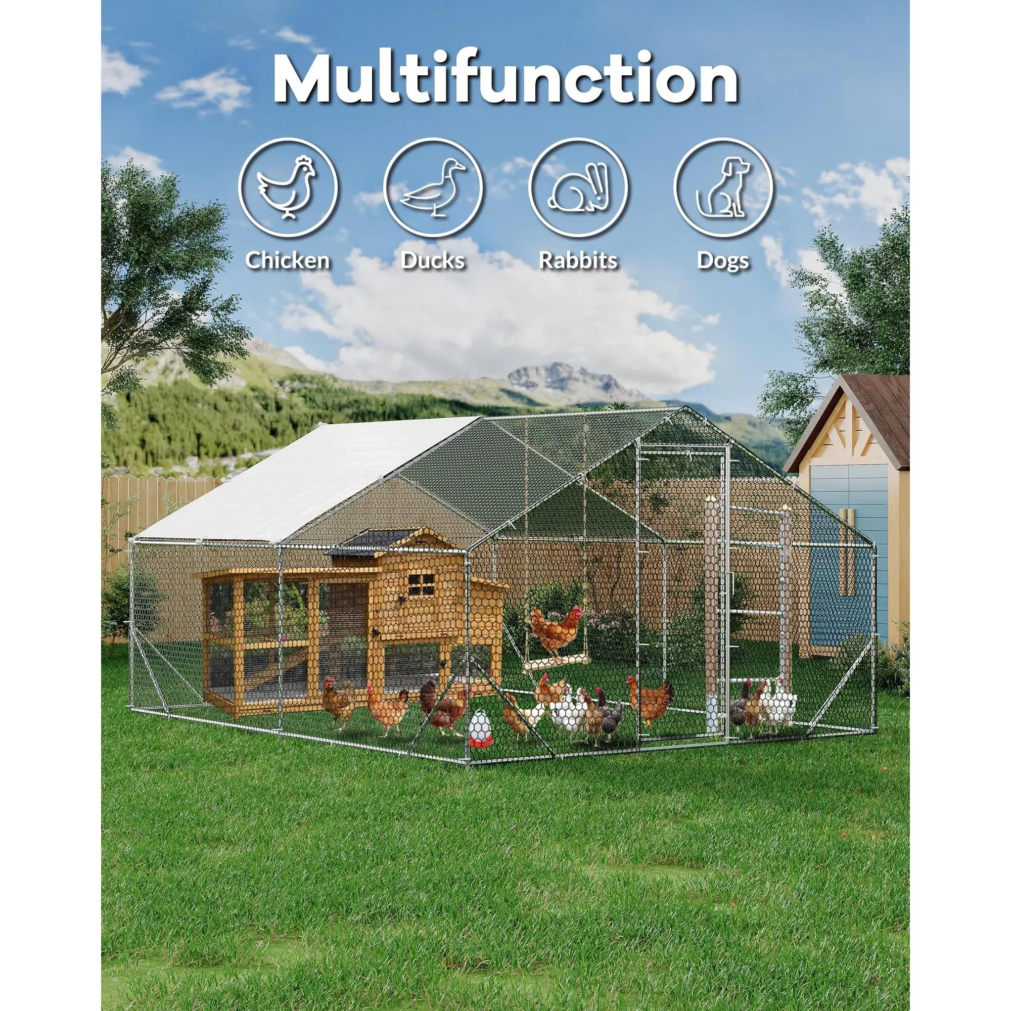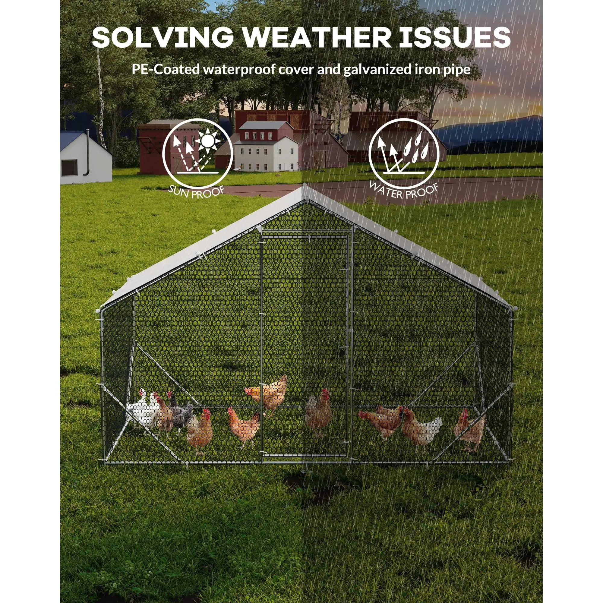 ·2.【Weatherproof & UV-Resistant Cover】 Keep your chickens protected with a chicken run featuring a waterproof, UV-resistant PE tarp cover. Designed for all weather, this chicken pen outdoor with top shields poultry from rain and sunlight, making it the ideal choice for chicken runs for yard with cover and walk-in chicken enclosures.