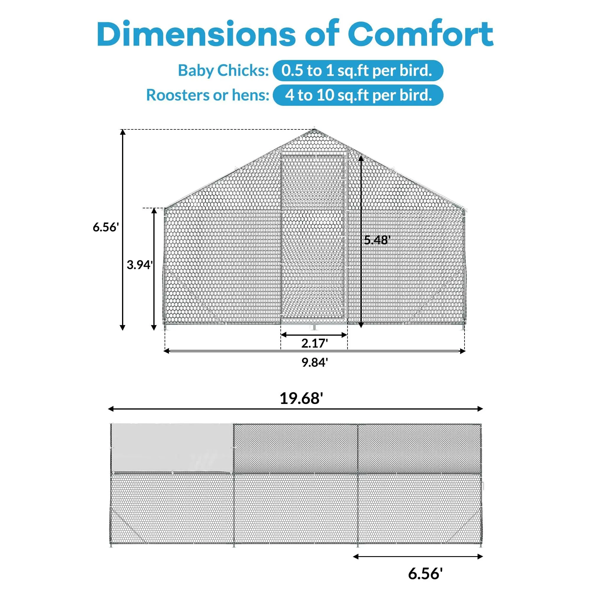 ·1.【Reinforced Galvanized Structure】 Build a durable outdoor chicken coop for your beloved flock with these chicken coop kits. Constructed from galvanized frames and upgraded reinforced galvanized pipe, this metal chicken coop offers superior sturdiness and lasting quality compared to other chicken coops on the market.