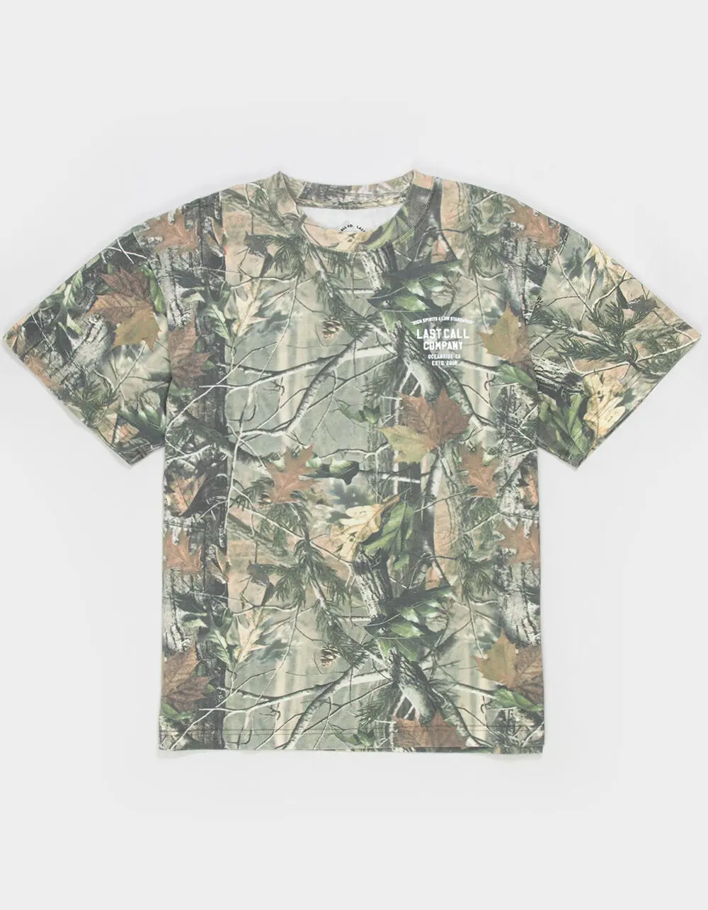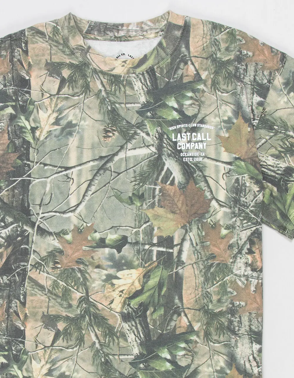 Last Call Co. High Spirit Heavyweight Tee. Allover camo pattern. Text screened at left chest. Large text screened on back. Crew neck. Short sleeve. Heavyweight fabric. 100% Cotton. Machine wash. Imported.