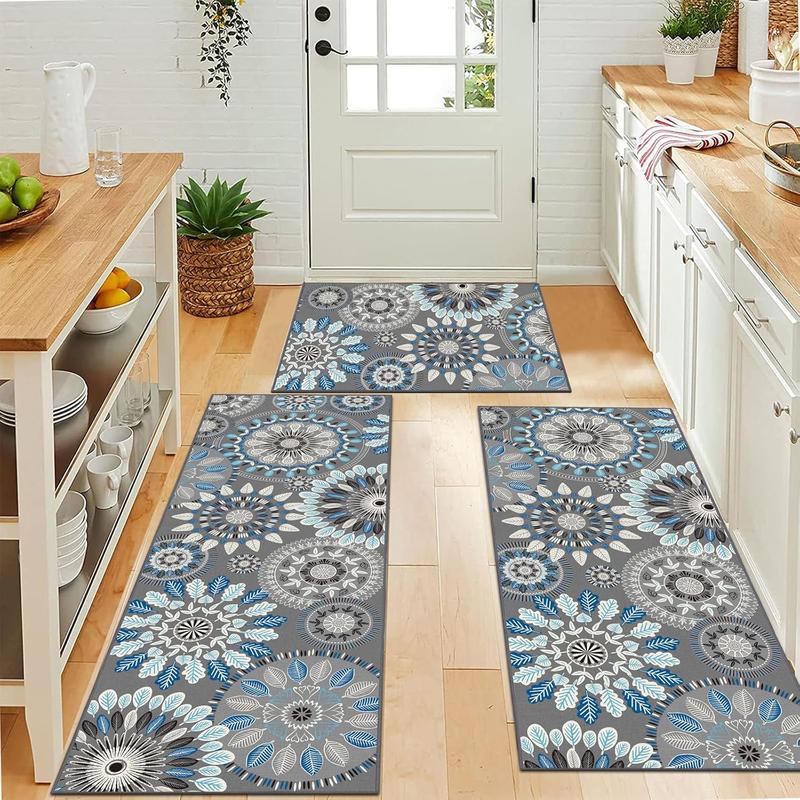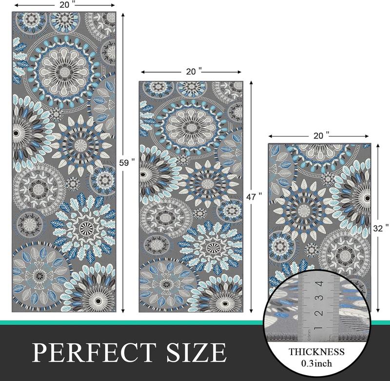 This bohemian kitchen mat is made of polyester, which is strong and durable and will not deform and fade. With a thickness of 0.2inch, it will not block the door even when placed in the doorway. Its size is 20 "x32"+20 "x47"+20 "x59".