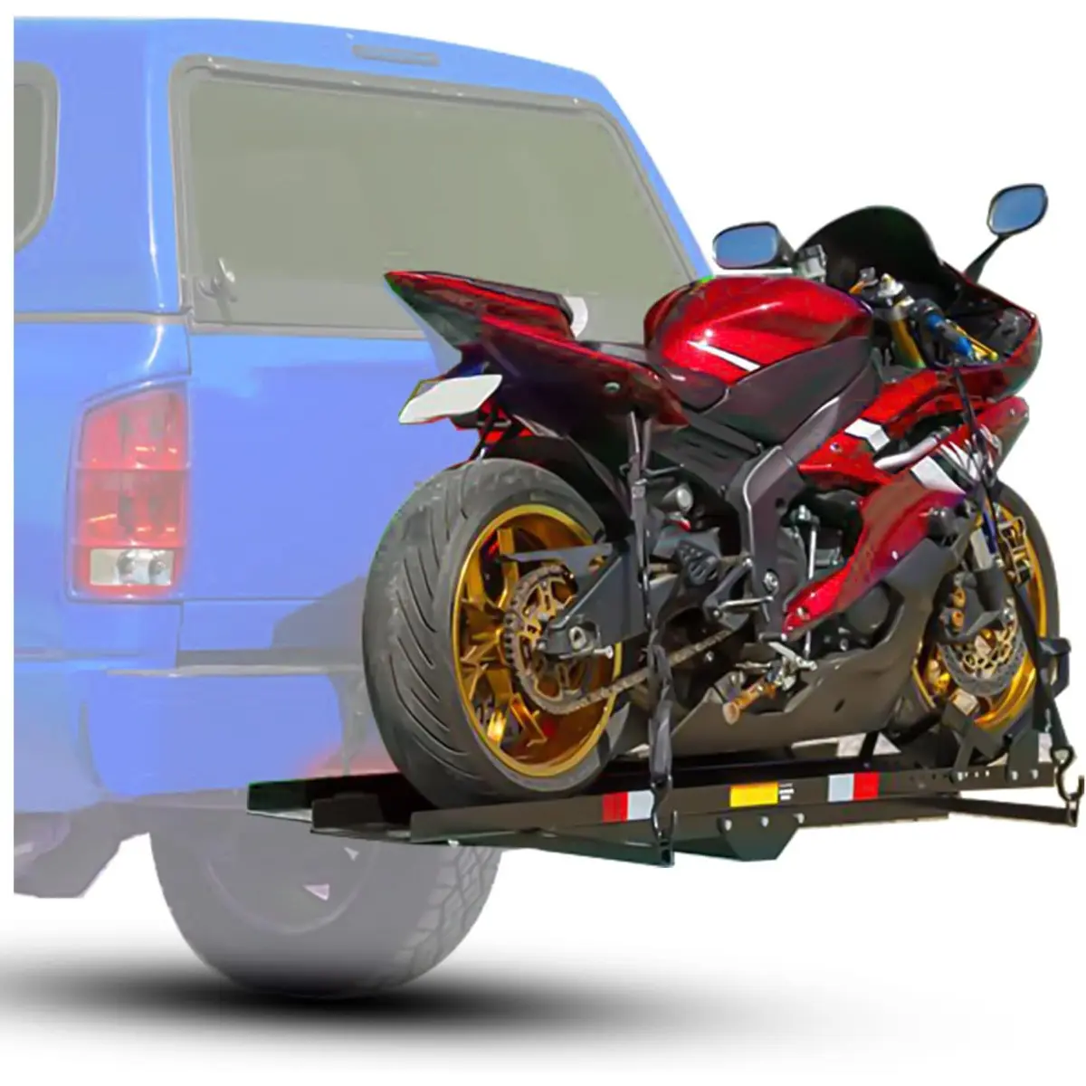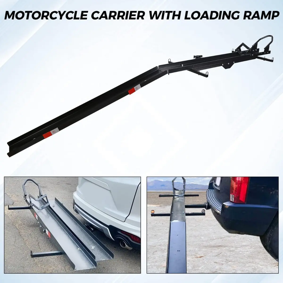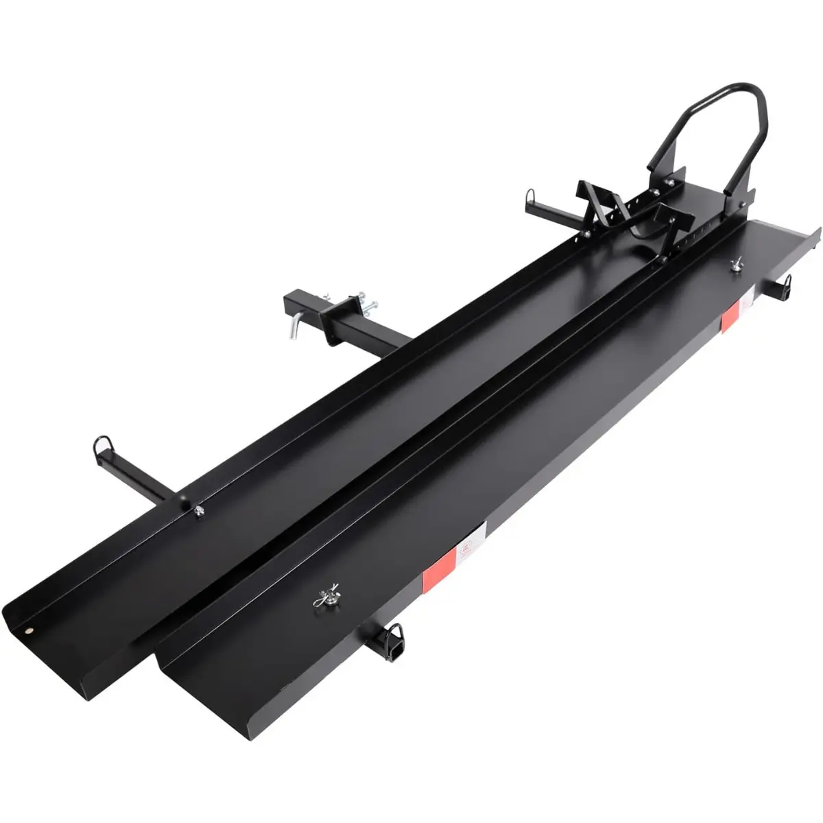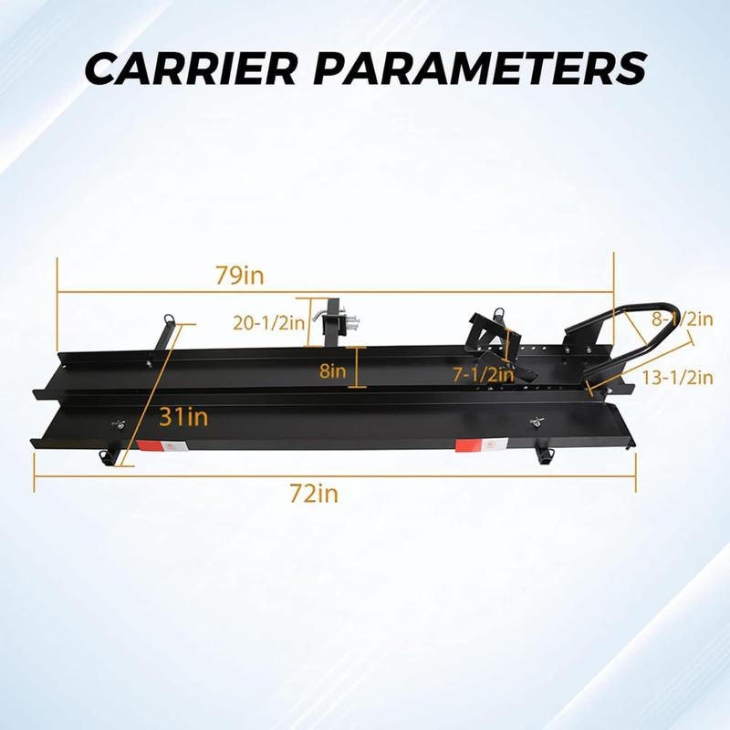 ·Carrier Parameter: Mounts using your vehicle's 2" receiver, hitch pin included with is 3/4". Rail is 79" long with a raised adjustable wheel stop that serves as a stabilizing wheel chock. Carrier Track: 79"x8". Loading Ramp: 72"x7.5". Weight Capacity: 600 lbs