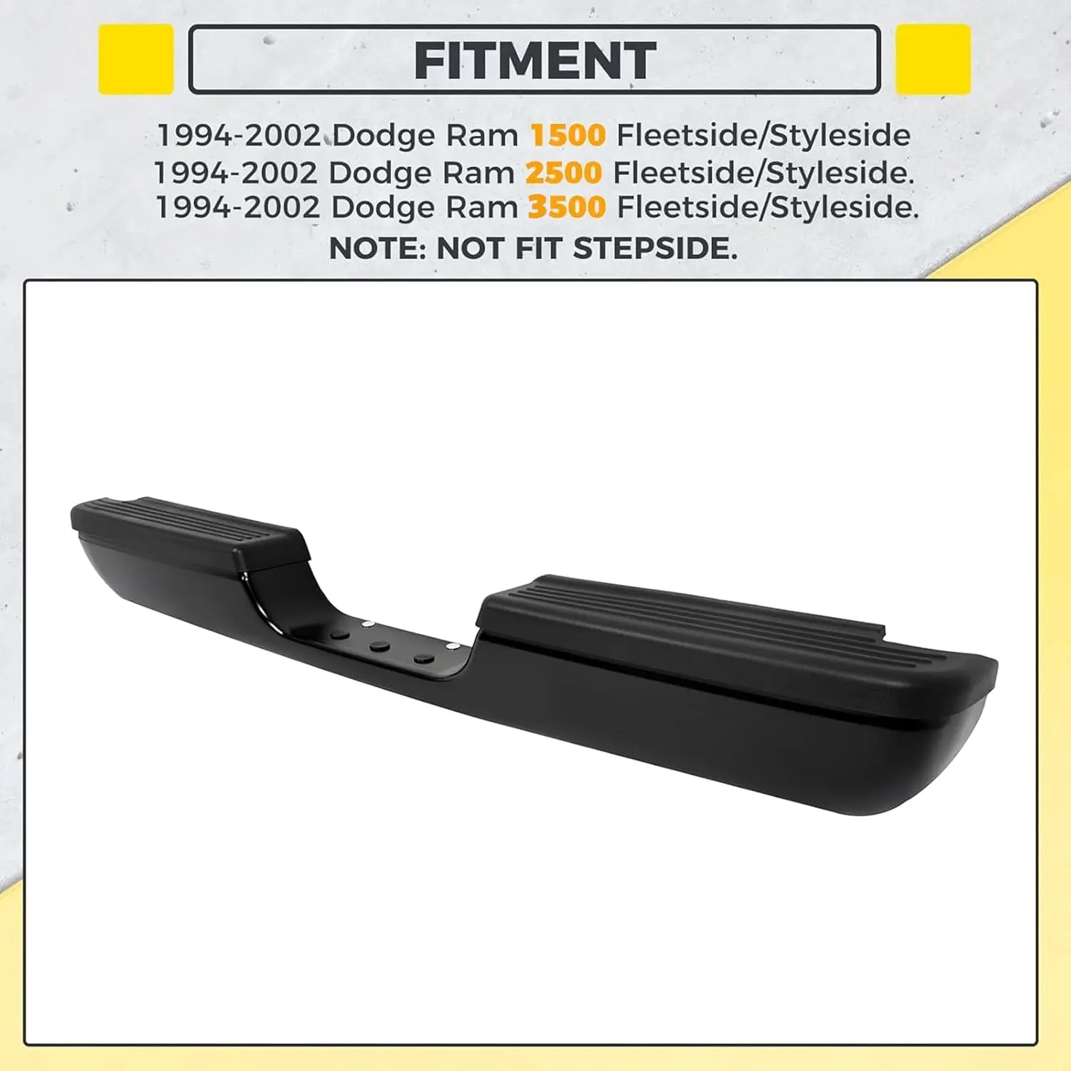 ·Compatibility - The rear bumper is compatible with 1994-2002 Dodge Ram 1500 2500 3500 Fleetside/Styleside. Note: Not Fit Stepside