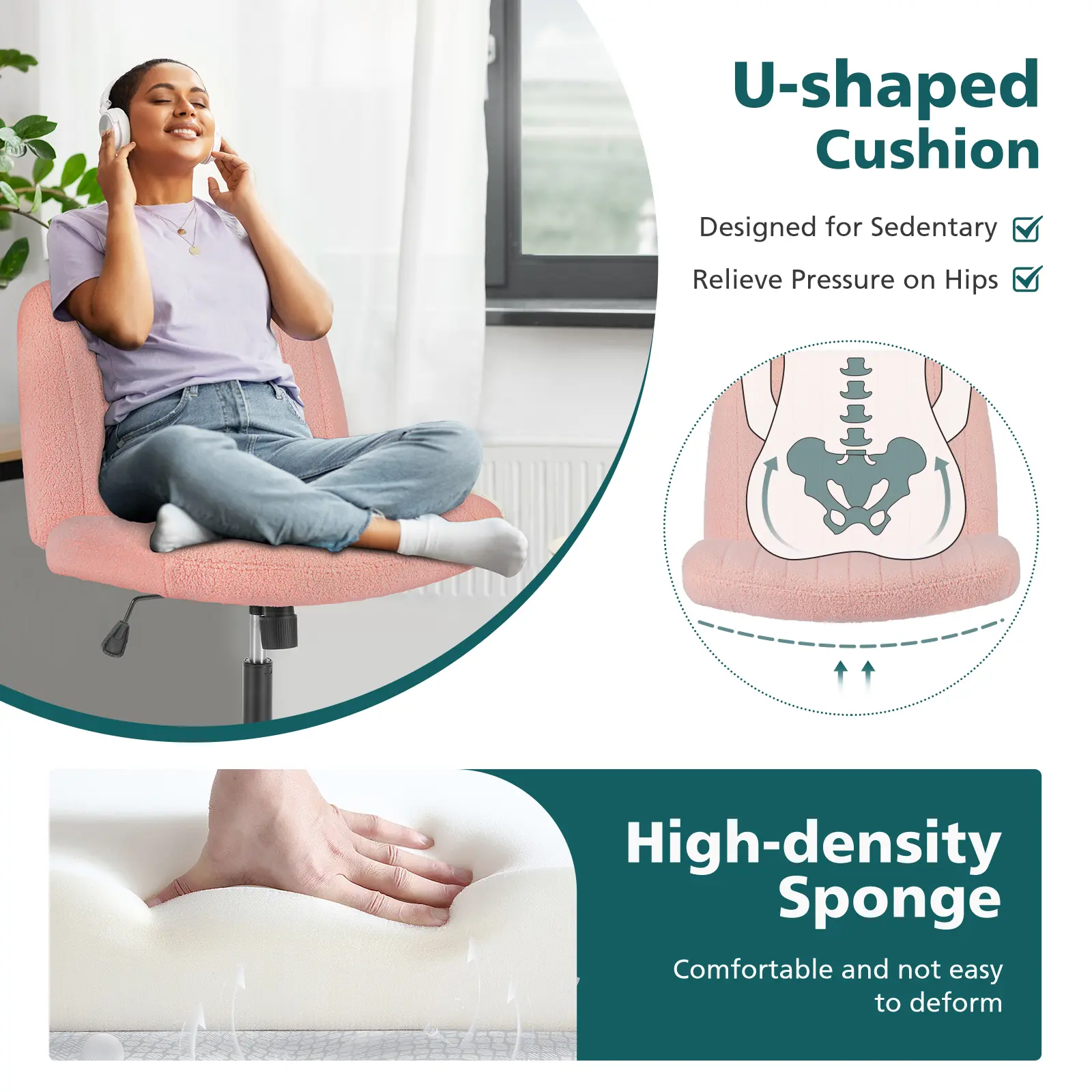 Very comfortable as a chronic untreated pain patient thats a huge deal the material is fuzzy and soft lots of cushin and very pretty i was hesatent about the wheels since i have carpet in my room ,it wasnt a problem it glides seamlessly around my room with no problems