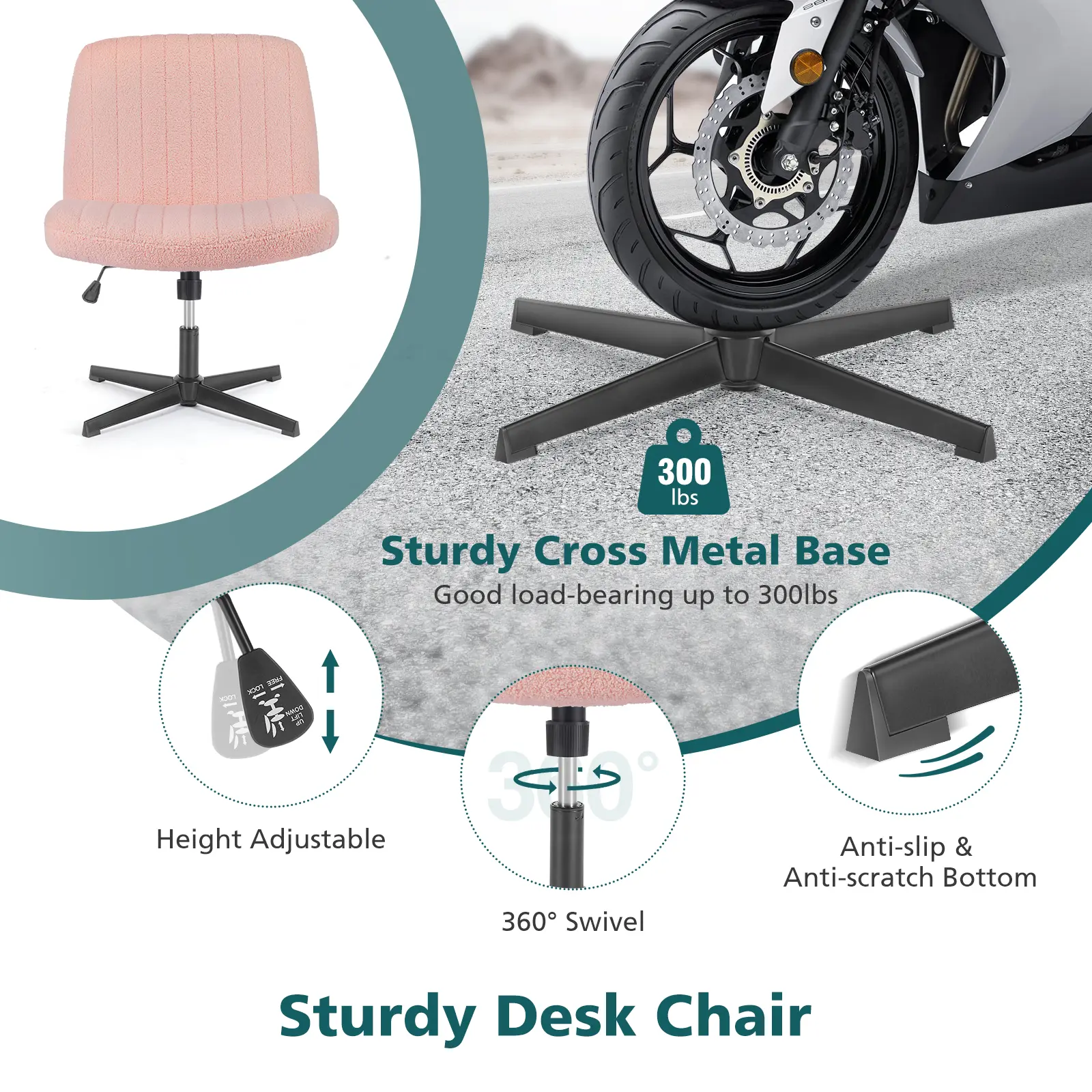 very good quality, soft, cushioned, perfect space for legs, amazing color, overall very good investment for my desk (also very easy to put together, comes with the tools and screws)