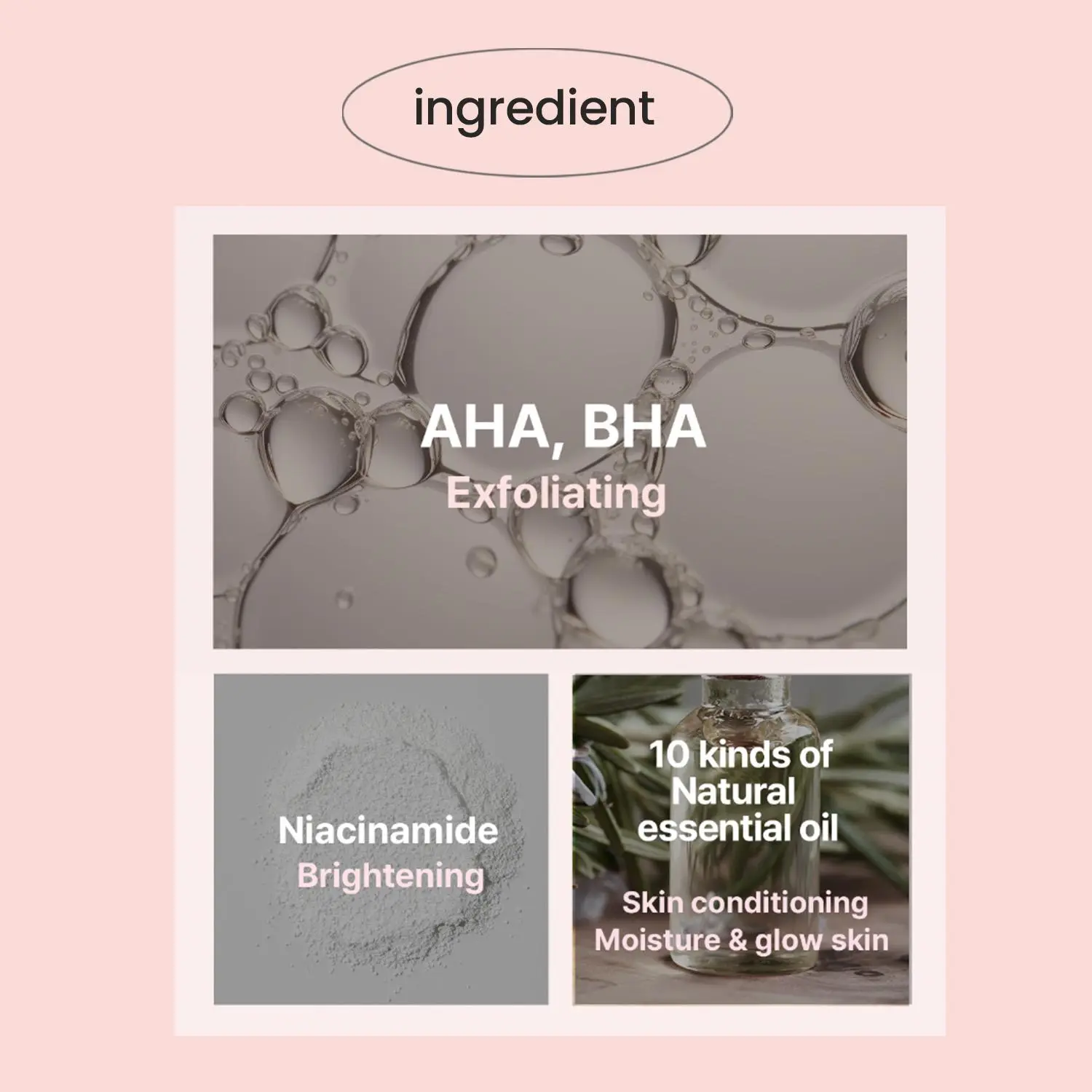 ·Salicylic Acid: Exfoliates, clears pores, and helps treat acne and blemishes.