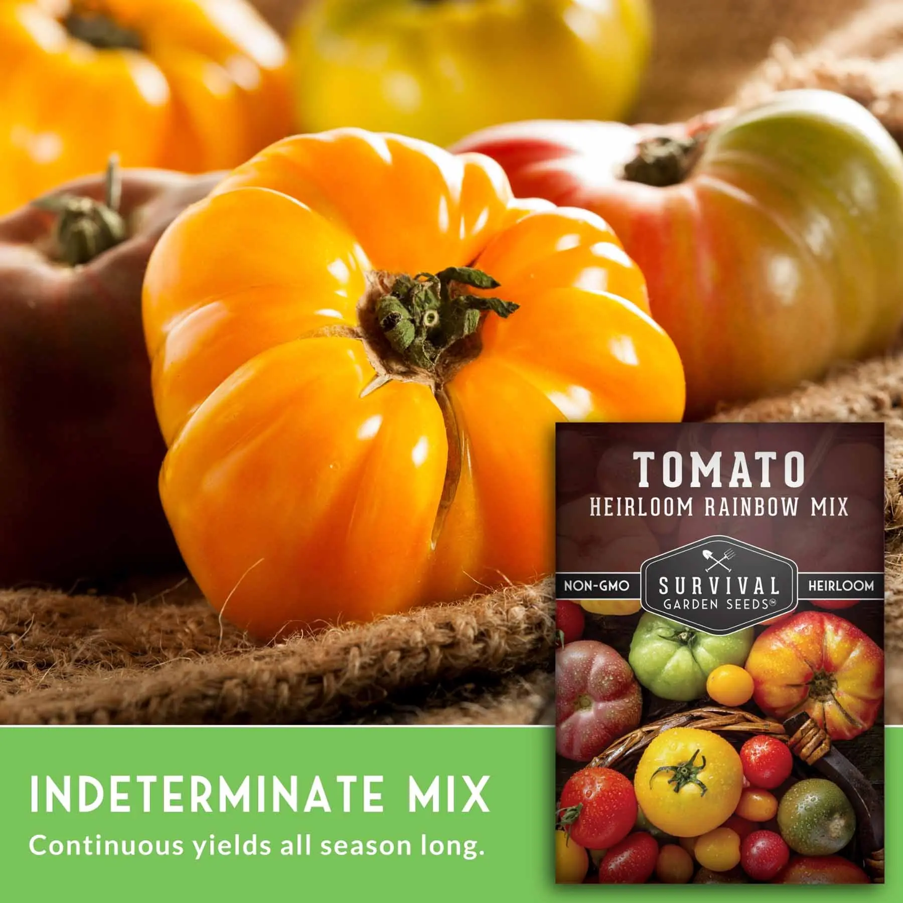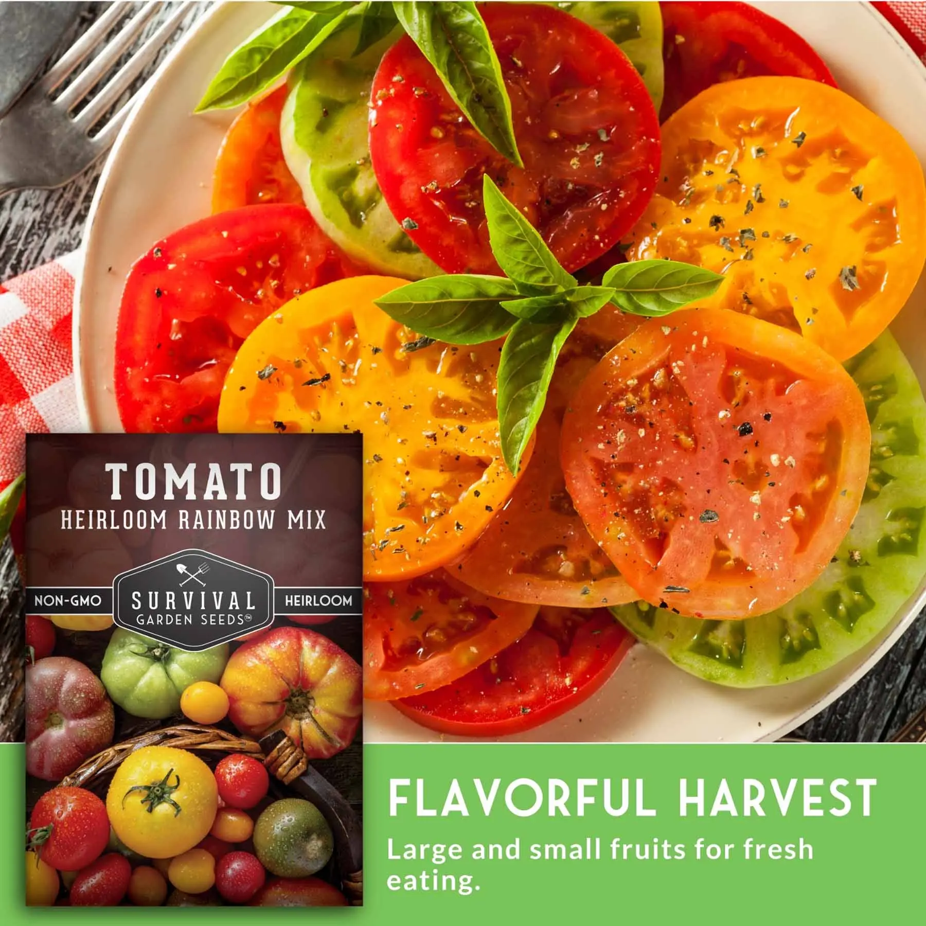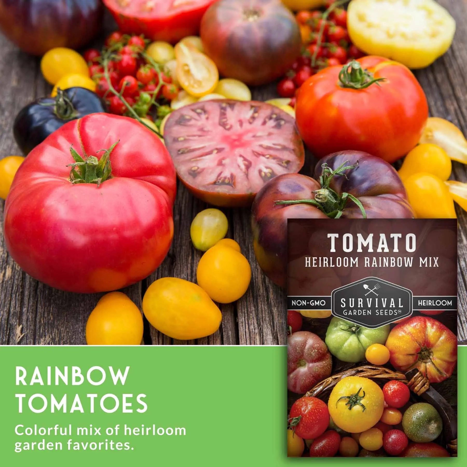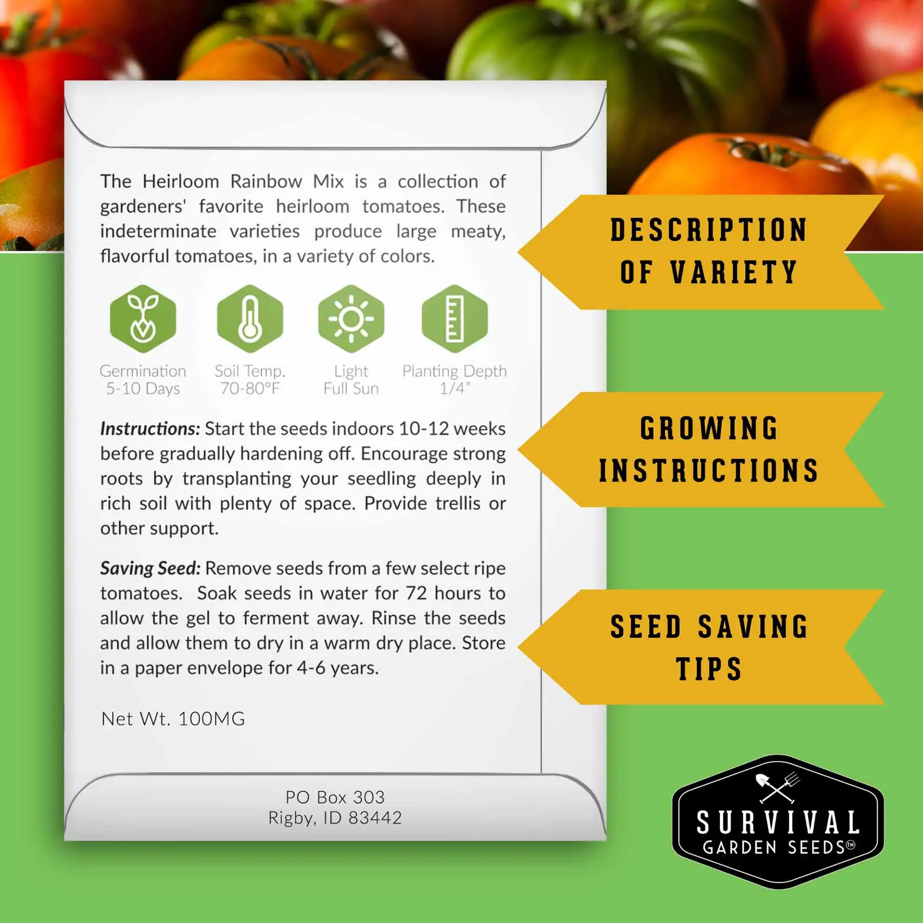 Survival Garden Seeds Heirloom Rainbow Blend tomato seeds are prized for their colors and their flavors. You'll be the envy of all your neighbors when you grow these in your home vegetable garden. These seeds for planting in your family vegetable garden will help secure your family's food needs. Each package includes instructions for successful growing to help even a beginner gardener get started