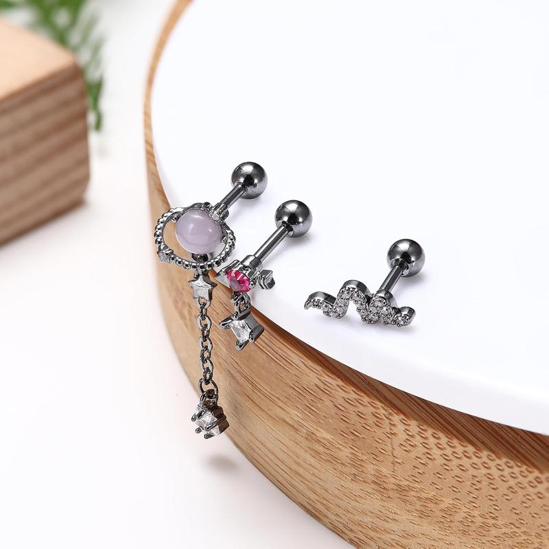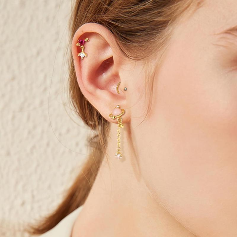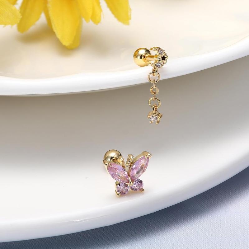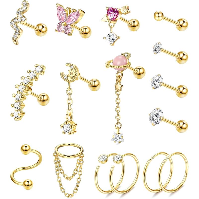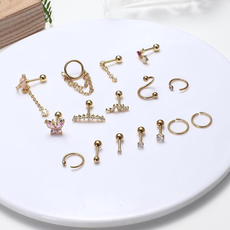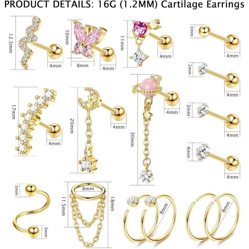 CARTILAGE EARRING SET: One order includes 16 count cartlidge jewelry: ball and cz cartilage earring stud, snake and butterfly cartilage earring, dangle helix jewelry, and cartilage hoops. Multiple styles to decorate your ears to make more charming.