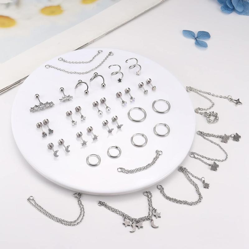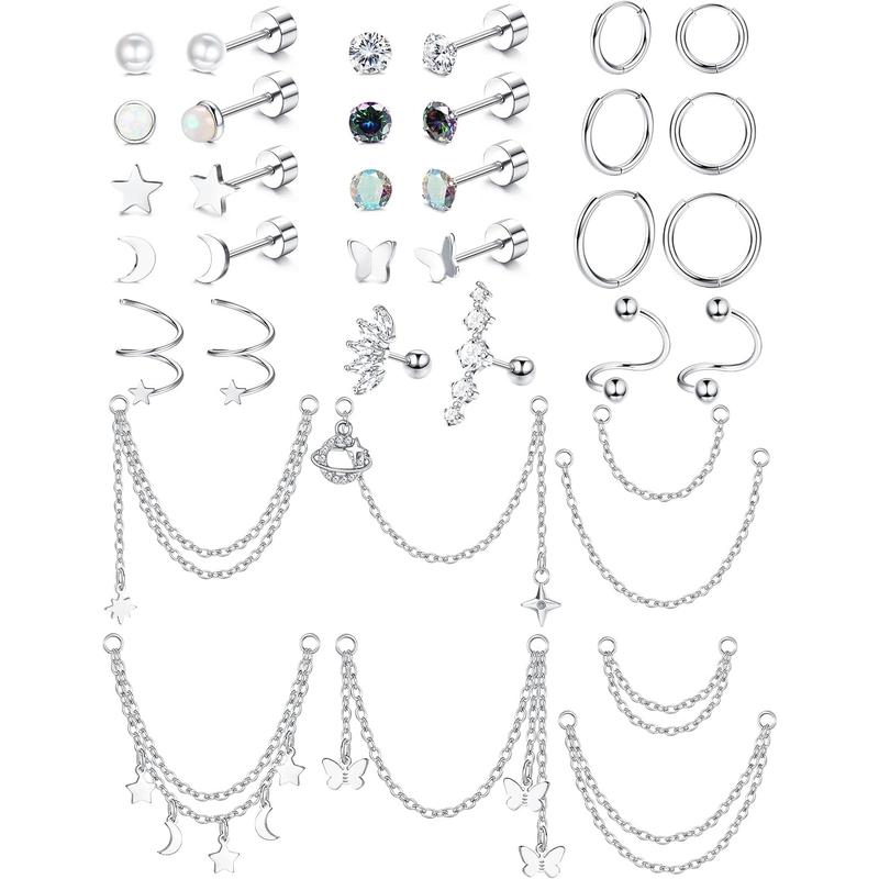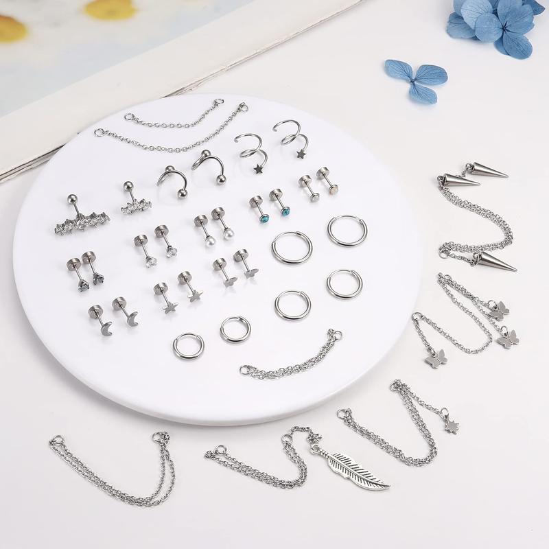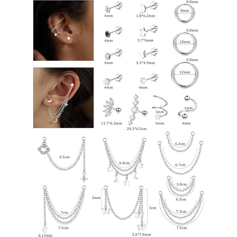 ·【Cartilage Earrings Set】Comes with 8pairs flat back stud earrings, 3pairs cartilage hoops, 2pairs twisted ball and star earrings, 2pcs CZ cartilage earrings and 8pcs chain dangle piercing in a set.You can wear them alone or in any combination with the chain, enjoy the fun of DIY, rich designs can meet your diverse wear needs.