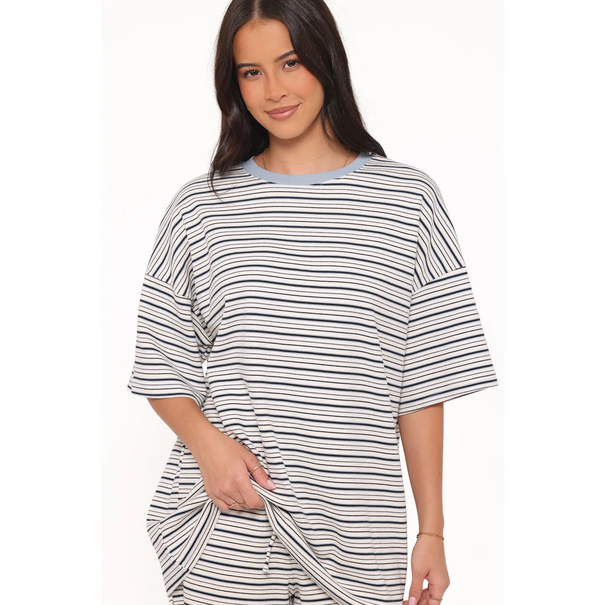 Featuring an oversized tee with a round neckline and short sleeves, this set is as breathable as it is chic. The matching high-rise shorts are fitted with an elasticised waistband and a convenient drawstring tie, giving you a customised fit without compromising on ease.