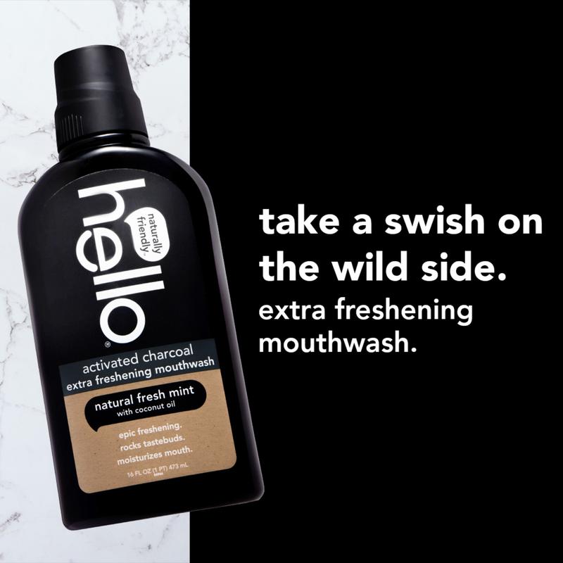 Say hello to friendly activated charcoal extra freshening mouthwash. This thoughtfully formulated product uses activated charcoal made from sustainable bamboo, coconut oil to moisturize, fresh mint to freshen breath, and xylitol because it rocks.