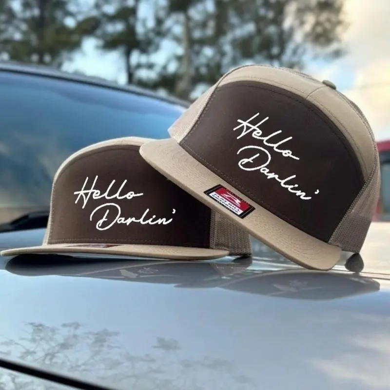 Say "Hello Darlin'" with style and attitude in this 7-Panel Trucker Hat Collection. Available in Camo, Black, White, and Khaki Brown, these unisex fitted hats bring a fun, old-school vibe with a modern twist. Featuring a classic 7-panel design, these caps offer a structured fit for both men and women, making them perfect for everyday wear, outdoor adventures, or just adding a touch of personality to your look. Whether you're out with friends, at a concert, or just kicking back, these hats are sure to make a statement.