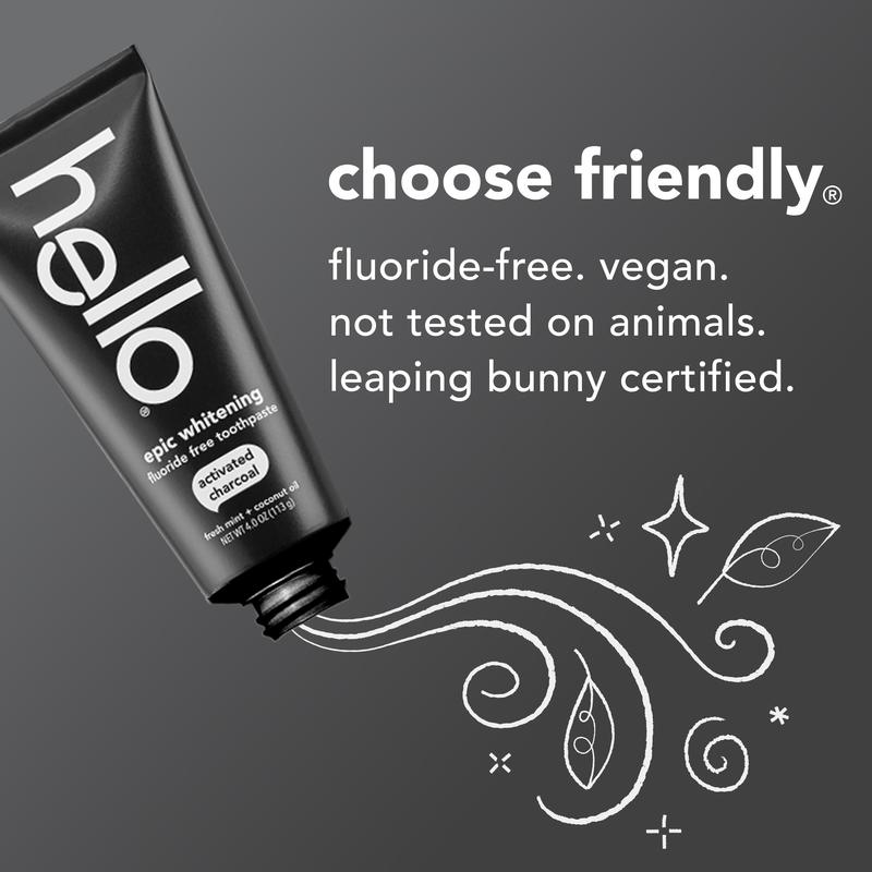 Say hello to a friendly teeth whitening toothpaste with Hello Epic Whitening Activated Charcoal Toothpaste. This fluoride-free pack is formulated with ingredients like fresh mint, coconut oil, and activated charcoal. It's safe for enamel and freshens your breath. Made with activated charcoal from bamboo, this black toothpaste works brilliantly and tastes awesome.
