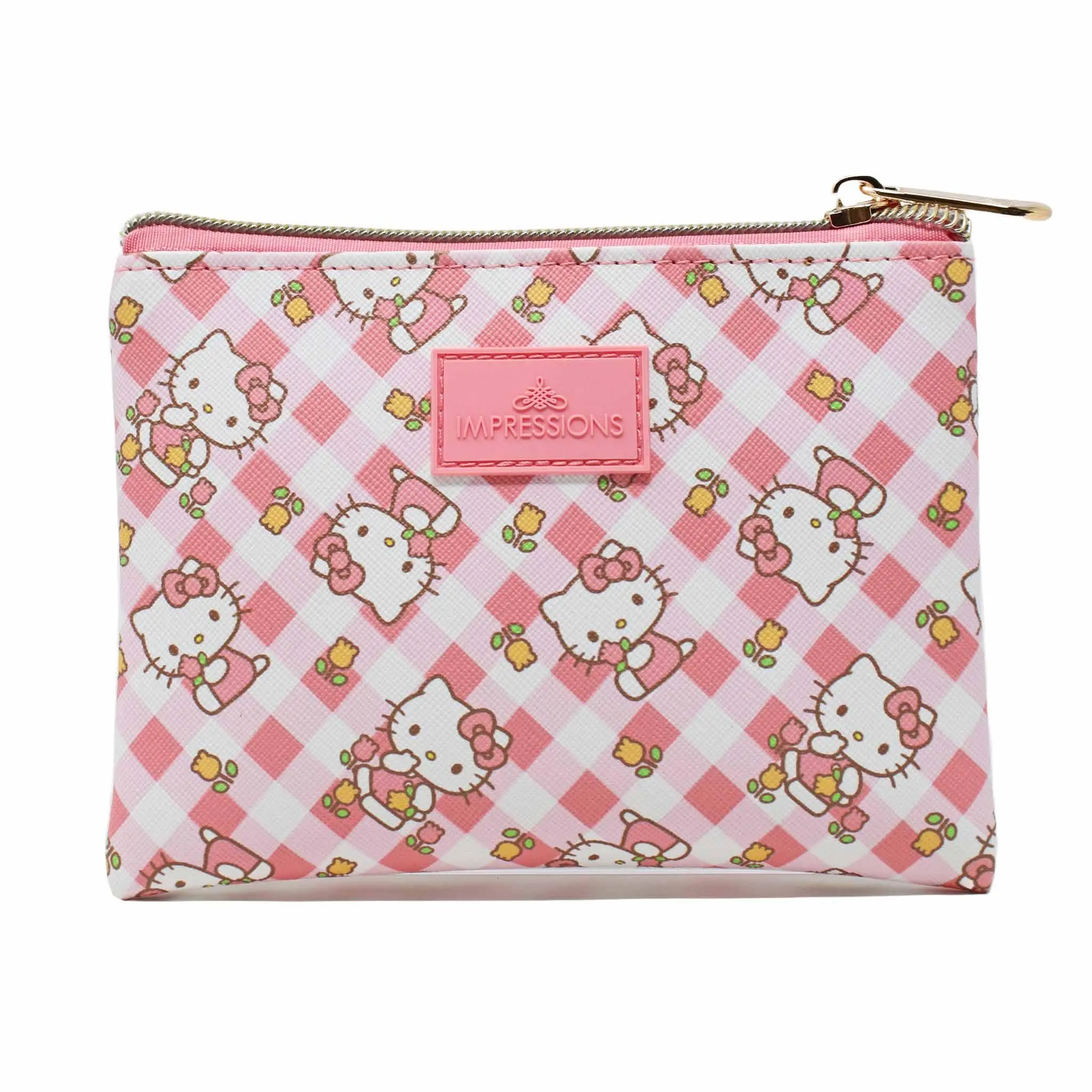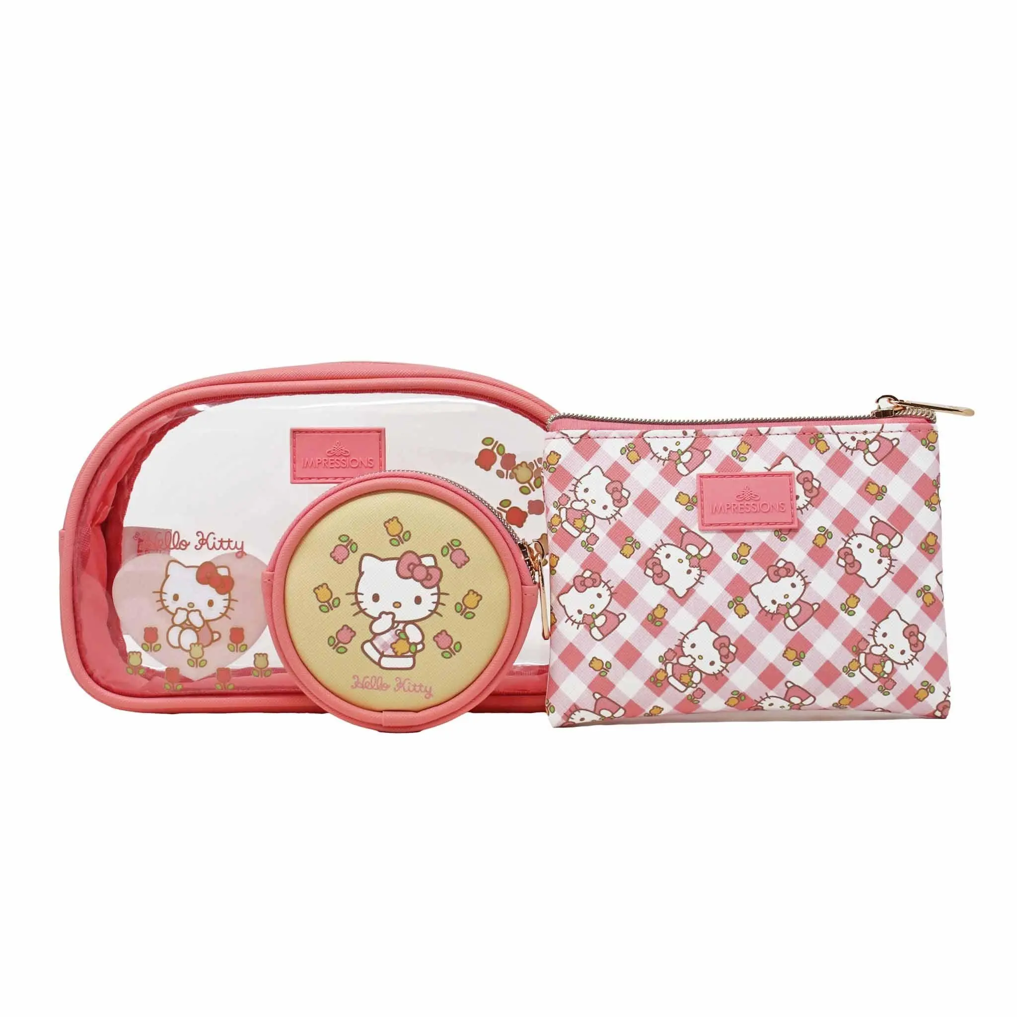 Travel in style with our Hello Kitty® 3-Pc Makeup Bag Set. Perfectly designed to fit all your essentials, this set is a must-have for anyone on the go! The clear, larger pouch is perfect for bulky items while the medium and smaller pouch is perfect for your daily makeup. Don't miss out on this set! Official Licensed Sanrio® Product Why We Love It: Nested design makes it easy to use together or separately. Compact size makes it ideal for traveling, events, or day to day travel. Larger Pouch Large Outer Pouch Features Clear Silhouette Designs. Conveniently made of a clear PVC material that's water resistant and easy-to-clean. Medium Pouch Hello Kitty Gingham Artwork The medium slim pouch gives your essentials privacy with it's supercute pastel print design. Inner slip pocket Smaller Pouch Hello Kitty Blossom Artwork The small pouch is perfect for smaller essentials on-the-go. (Width x Height x Depth) Outer Pouch 9 x 5.5 x 2.5" in. Medium Pouch 6 x 4.5" in. Small Pouch 4 x 4" in.