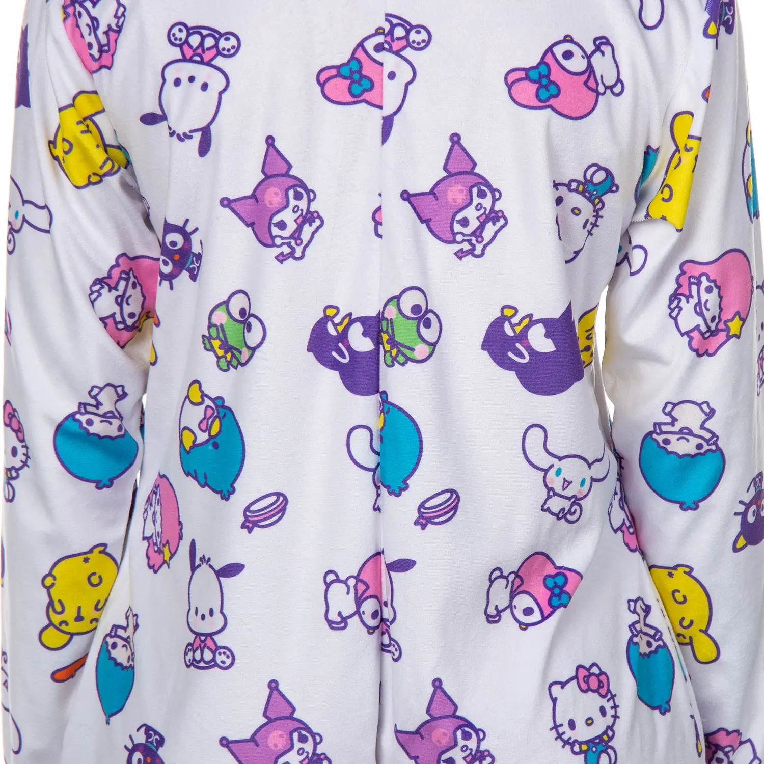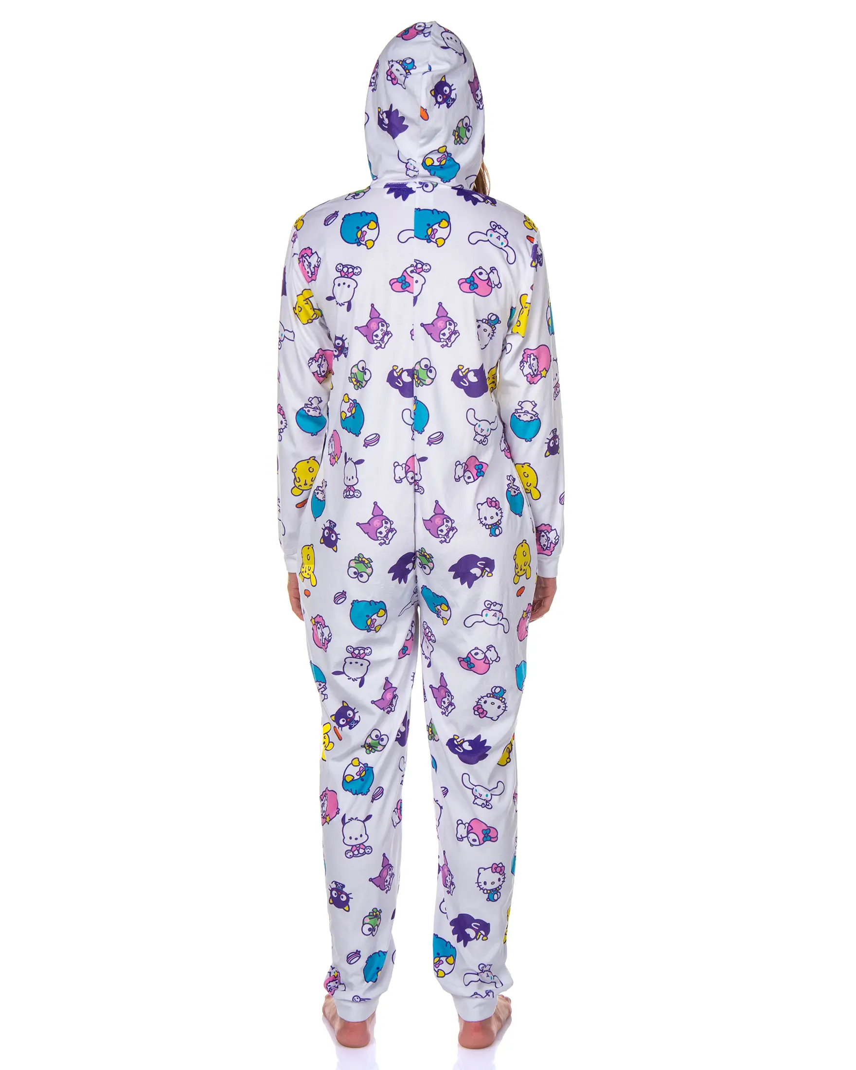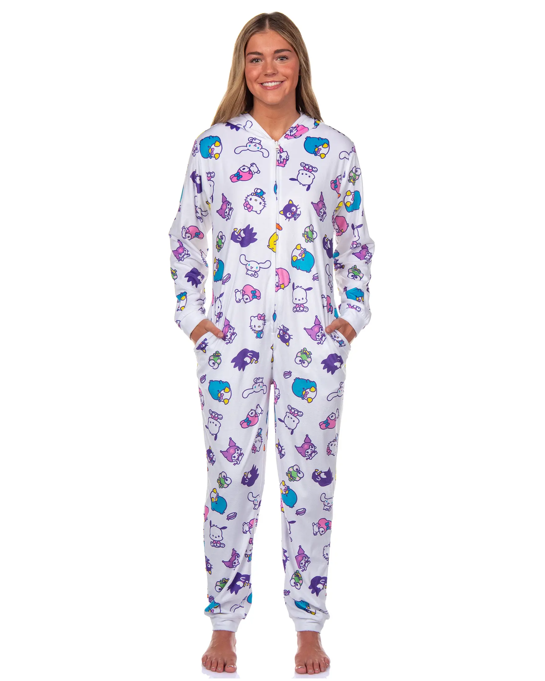 Wrap yourself in the playful charm of Hello Kitty & Friends with this ultra-comfy women's union suit. Featuring an all-over print of beloved characters like Keroppi, Chococat, and Tuxedosam, this one-piece pajama is designed for fans who love cute and cozy styles. The soft, lightweight polyester fabric keeps you warm without weighing you down, making it a go-to choice for lounging at home, weekend relaxation, or fun sleepovers. Designed for comfort and convenience, this union suit features a full front zipper for easy wear, a cozy hood for extra warmth, and functional side pockets for keeping small essentials within reach. The footless design and ribbed cuffs ensure a relaxed yet secure fit, letting you move freely while staying snug. Whether you're unwinding after a long day or looking for a fun addition to your sleepwear collection, this Hello Kitty & Friends union suit delivers comfort with a touch of nostalgia. Adorable Allover Character Design: Show off your love for Hello Kitty & Friends with a colorful, allover print featuring Keroppi, Chococat, Tuxedosam, and more. Whether lounging or sleeping, this playful design brings extra fun to your downtime Cozy and Lightweight Comfort: This union suit is made from soft, lightweight 100% polyester and keeps you warm without feeling bulky. The breathable fabric ensures all-day comfort, making it a great choice for lounging, movie nights, or pajama parties Convenient Full-Zip & Hood: Designed for ease and style, this one-piece pajama features a full front zipper, making it simple to slip on and off. The attached hood adds an extra cozy touch, ideal for staying warm on chilly days Functional and Footless: Move freely with the footless design, offering a relaxed fit that works with socks or slippers. Ribbed cuffs at the wrists and ankles provide a snug yet comfy feel.