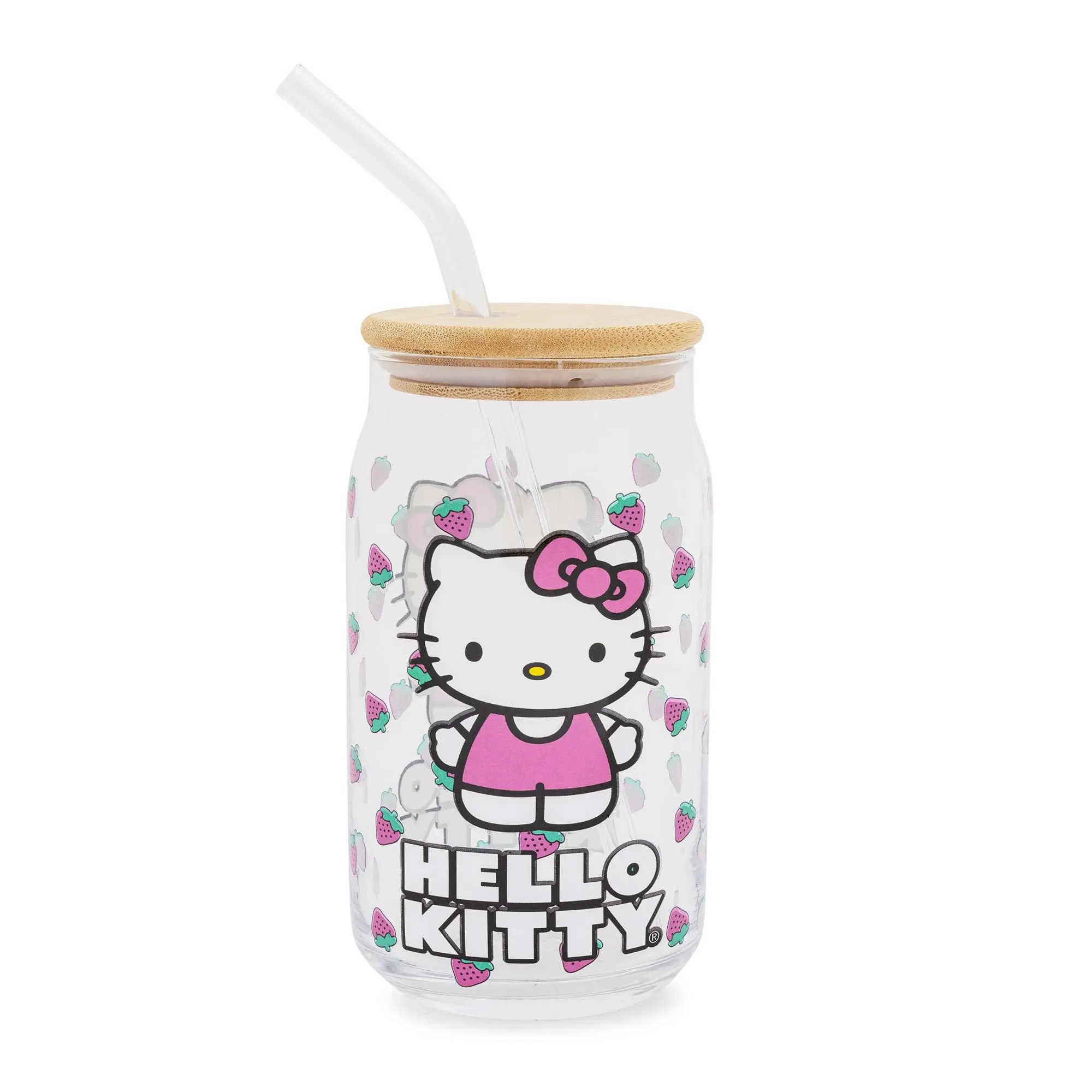 Sanrio Hello Kitty Strawberry 16-Ounce Glass Tumbler With Bamboo Lid and Straw