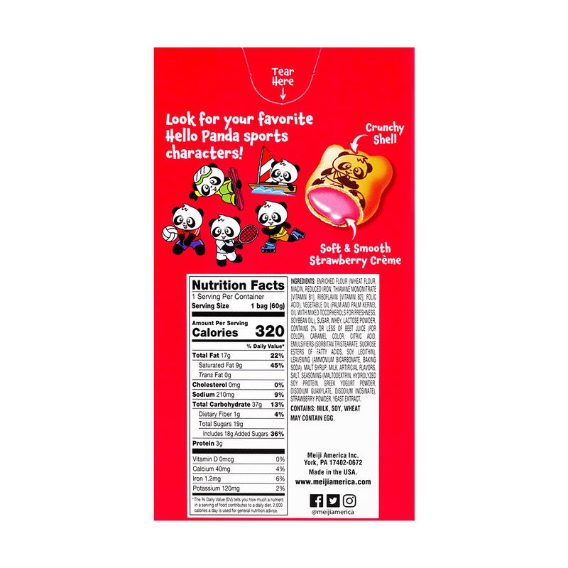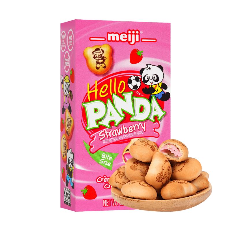 MEIJI Hello Panda Biscuit with Strawberry Cream Filling is a tempting biscuit treat for morning or afternoon tea. Each bite-size biscuit in this box has an adorable picture of a panda playing a sport (including badminton, sailing, and boxing) on the outer biscuit shell casing, while the inside is filled with a luscious strawberry flavored filling.