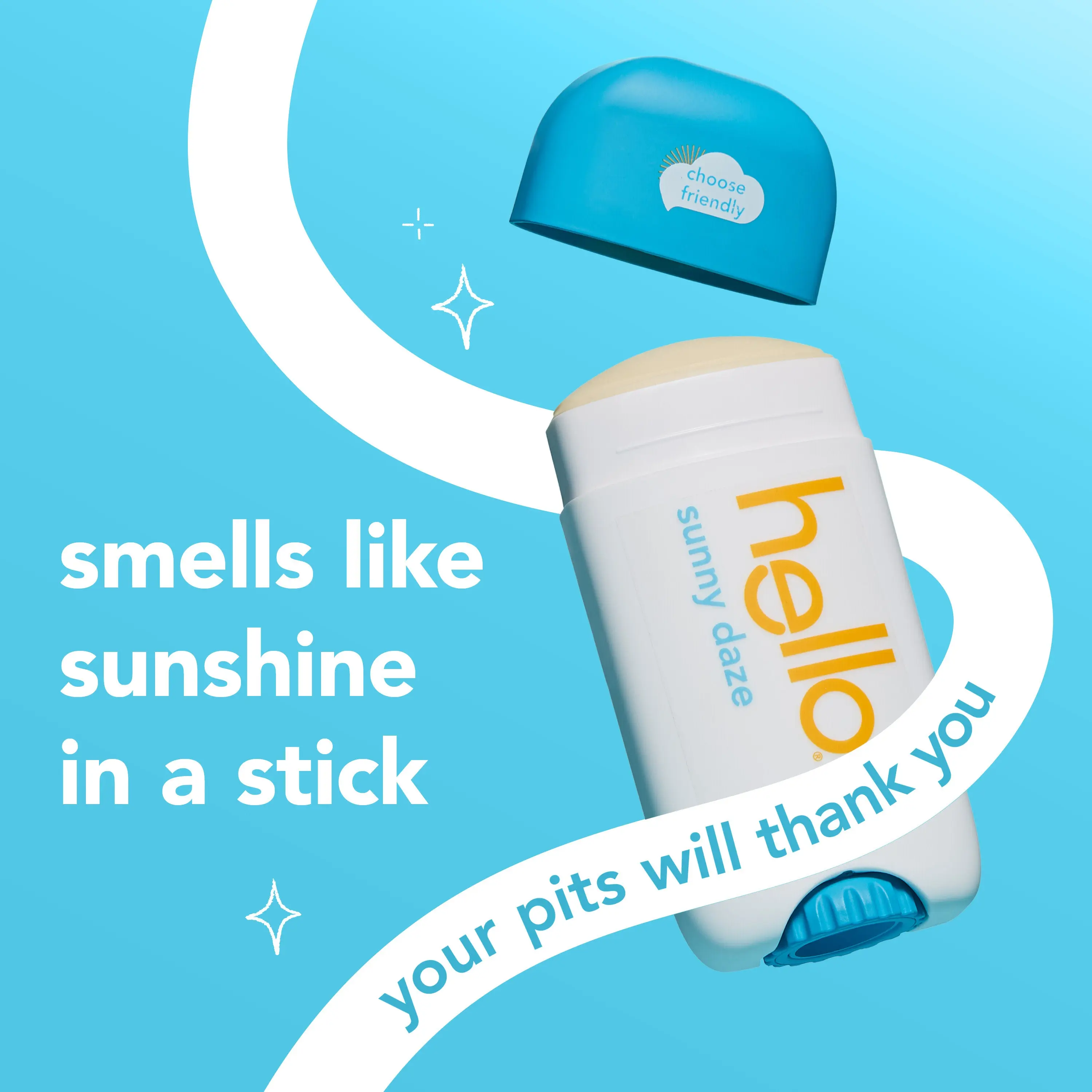 Say hello to Hello Sunny Daze aluminum-free deodorant. This bright, refreshing mix of citrus, white tea, and a hint of warm vanilla will leave you smelling like sunshine. 🍋🍵