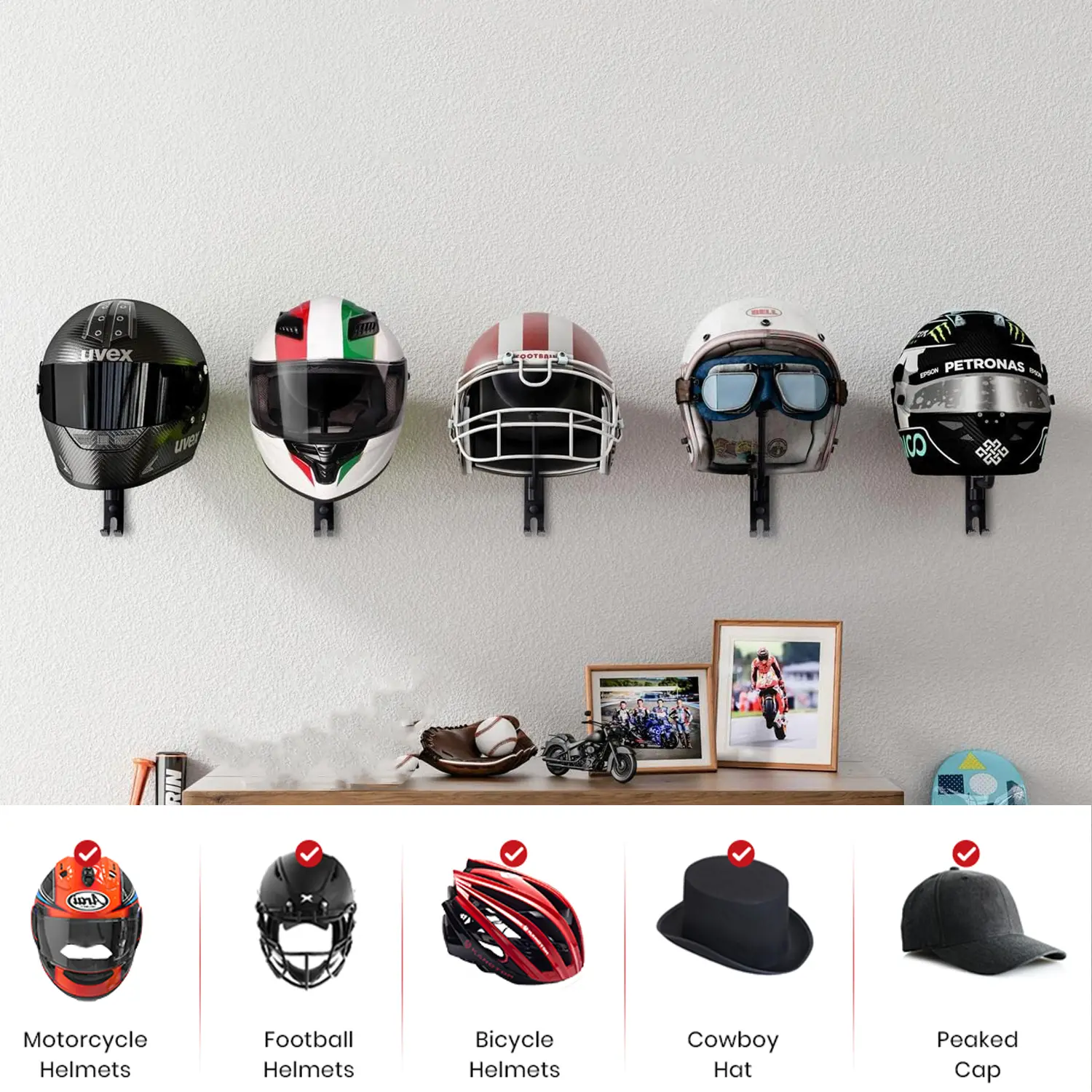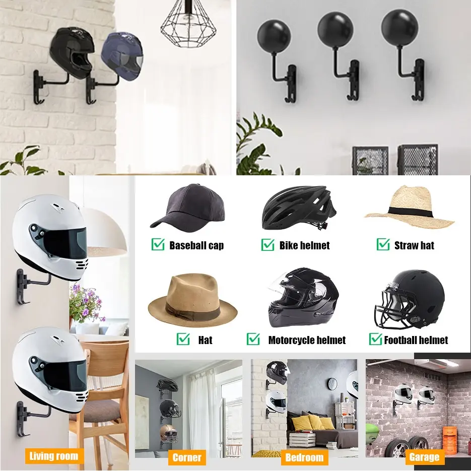 【Versatile application】: Designed to hold various types of helmets, including motorcycle, cycling, and football helmets.