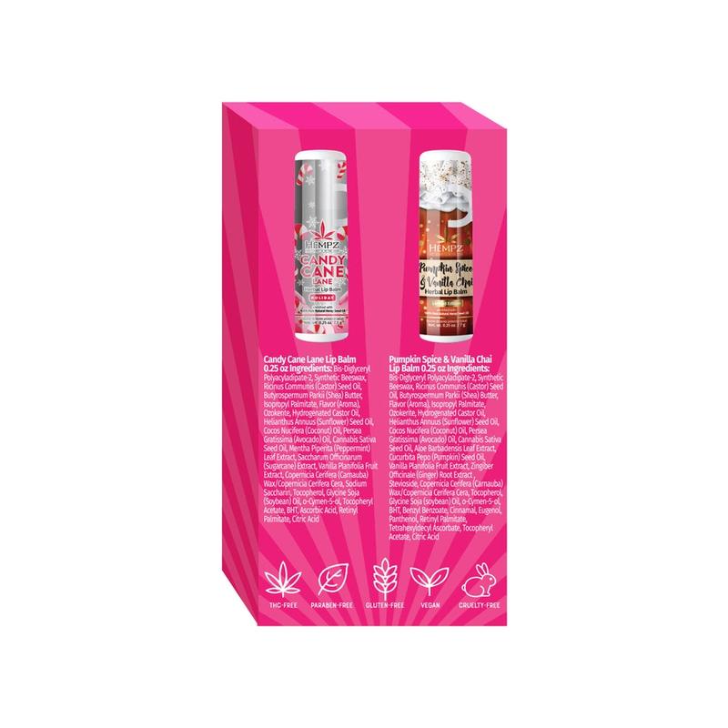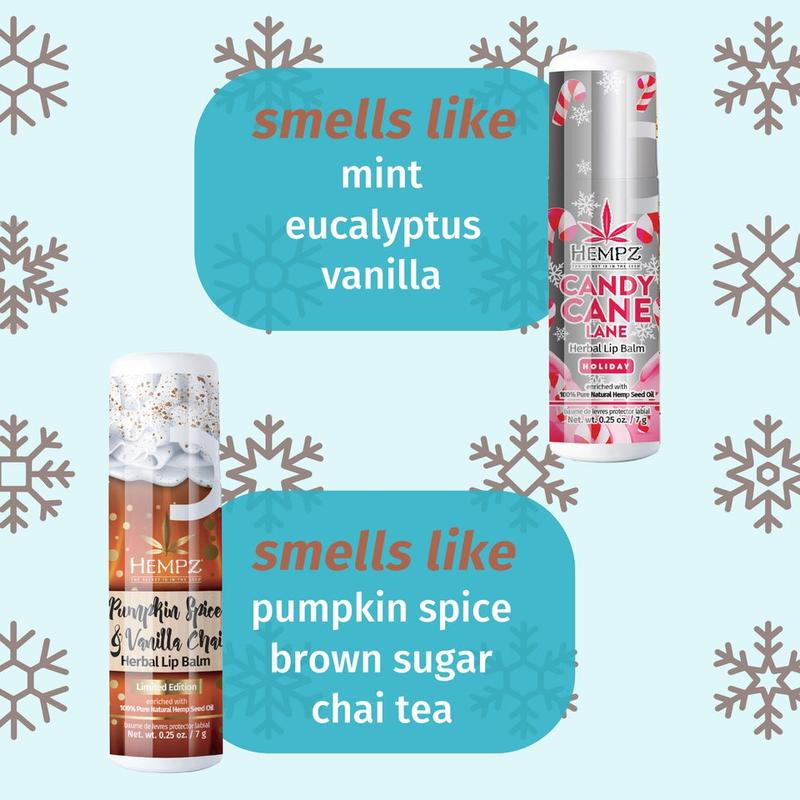 | Ingredients | PUMPKIN SPICE Bis-Diglyceryl Polyacyladipate-2, Synthetic Beeswax, Ricinus Communis (Castor) Seed Oil, Butyrospermum Parkii (Shea) Butter, Flavor (Aroma), Isopropyl Palmitate, Ozokerite, Hydrogenated Castor Oil, Helianthus Annuus (Sunflower) Seed Oil, Cocos Nucifera (Coconut) Oil, Persea Gratissima (Avocado) Oil, Cannabis Sativa Seed Oil, Aloe Barbadensis Leaf Extract, Cucurbita Pepo (Pumpkin) Seed Oil, Vanilla Planifolia Fruit Extract, Zingiber Officinale (Ginger) Root Extract , Stevioside, Copernicia Cerifera (Carnauba) Wax/Copernicia Cerifera Cera, Tocopherol, Glycine Soja (soybean) Oil, o-Cymen-5-ol, BHT, Benzyl Benzoate, Cinnamal, Eugenol, Panthenol, Retinyl Palmitate, Tetrahexyldecyl Ascorbate, Tocopheryl Acetate, Citric Acid CANDY CANE Bis-Diglyceryl Polyacyladipate-2, Synthetic Beeswax, Ricinus Communis (Castor) Seed Oil, Butyrospermum Parkii (Shea) Butter, Isopropyl Palmitate, Flavor (Aroma), Ozokerite, Hydrogenated Castor Oil, Helianthus Annuus (Sunflower) Seed Oil, Cocos Nucifera (Coconut) Oil, Persea Gratissima (Avocado) Oil, Cannabis Sativa Seed Oil, Mentha Piperita (Peppermint) Leaf Extract, Saccharum Officinarum (Sugarcane) Extract, Vanilla Planifolia Fruit Extract, Copernicia Cerifera (Carnauba) Wax/Copernicia Cerifera Cera, Sodium Saccharin, Tocopherol, Glycine Soja (Soybean) Oil, o-Cymen-5-ol, Tocopheryl Acetate, BHT, Ascorbic Acid, Retinyl Palmitate, Citric Acid |