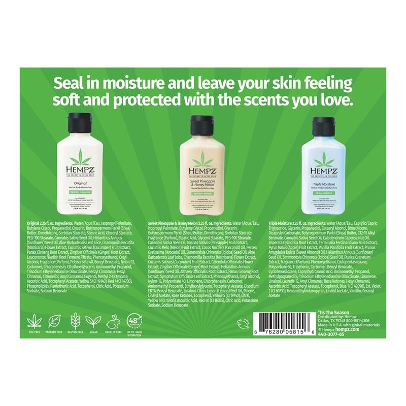 | Ingredients | ORIGINAL LOTION Water/Aqua/Eau, Isopropyl Palmitate, Butylene Glycol, Propanediol, Glycerin, Butyrospermum Parkii (Shea) Butter, Dimethicone, Sorbitan Stearate, Stearic Acid, Glyceryl Stearate, PEG-100 Stearate, Cannabis Sativa Seed Oil, Helianthus Annuus (Sunflower) Seed Oil, Aloe Barbadensis Leaf Juice, Chamomilla Recutita (Matricaria) Flower Extract, Cucumis Sativus (Cucumber) Fruit Extract, Panax Ginseng Root Extract, Zingiber Officinale (Ginger) Root Extract, Leuconostoc/Radish Root Ferment Filtrate, Phenoxyethanol, Cetyl Alcohol, Fragrance (Parfum), Polysorbate 40, Benzyl Benzoate, Nylon-12, Carbomer, Chlorphenesin, Ethylhexylglycerin, Aminomethyl Propanol, Trisodium Ethylenediamine Disuccinate, Benzyl Cinnamate, Hexyl Cinnamal, Citronellol, Amyl Cinnamal, Eugenol, Methyl 2-Octynoate, Ascorbic Acid, Tocopheryl Acetate, Yellow 5 (CI 19140), Red 4 (CI 14700), Phospholipids, Pantothenic Acid, Tocopherol, Citric Acid, Potassium Sorbate, Sodium Benzoate TRIPLE LOTION Water/Aqua/Eau, Caprylic/Capric Triglyceride, Glycerin, Propanediol, Cetearyl Alcohol, Dimethicone, Dicaprylyl Carbonate, Butyrospermum Parkii (Shea) Butter, C12-15 Alkyl Benzoate, Cannabis Sativa Seed Oil, Calodendrum Capense Nut Oil, Imperata Cylindrica Root Extract, Terminalia Ferdinandiana Fruit Extract, Pyrus Malus (Apple) Fruit Extract, Vanilla Planifolia Fruit Extract, Prunus Amygdalus Dulcis (Sweet Almond) Oil, Helianthus Annuus (Sunflower) Seed Oil, Simmondsia Chinensis (Jojoba) Seed Oil, Punica Granatum Extract, Fragrance (Parfum), Phenoxyethanol, Cyclopentasiloxane, Polysorbate 60, Tribehenin, Carbomer, Benzyl Benzoate, Cyclohexasiloxane, Caprylhydroxamic Acid, Aminomethyl Propanol, Methylpropanediol, Trisodium Ethylenediamine Disuccinate, Limonene, Linalool, Laureth-12, Amyl Cinnamal, Hexyl Cinnamal, Ascorbic Acid, Tocopheryl Acetate, Tocopherol, Blue 1 (CI 42090), Ext. Violet 2 (CI 60730) SWEET PINEAPPLE LOTION Water/Aqua/Eau, Isopropyl Palmitate, Butylene Glycol, Propanediol, Glycerin, Bu |