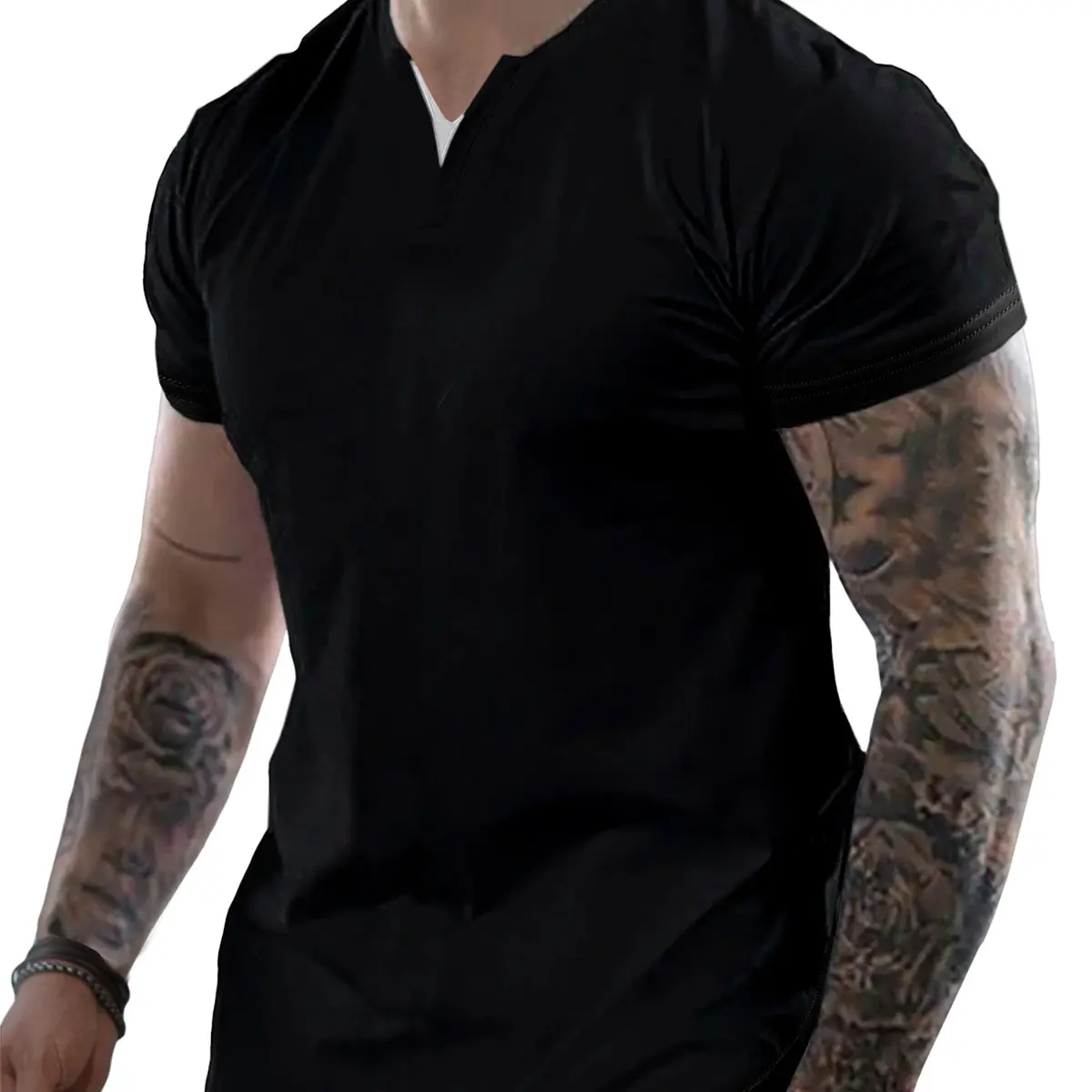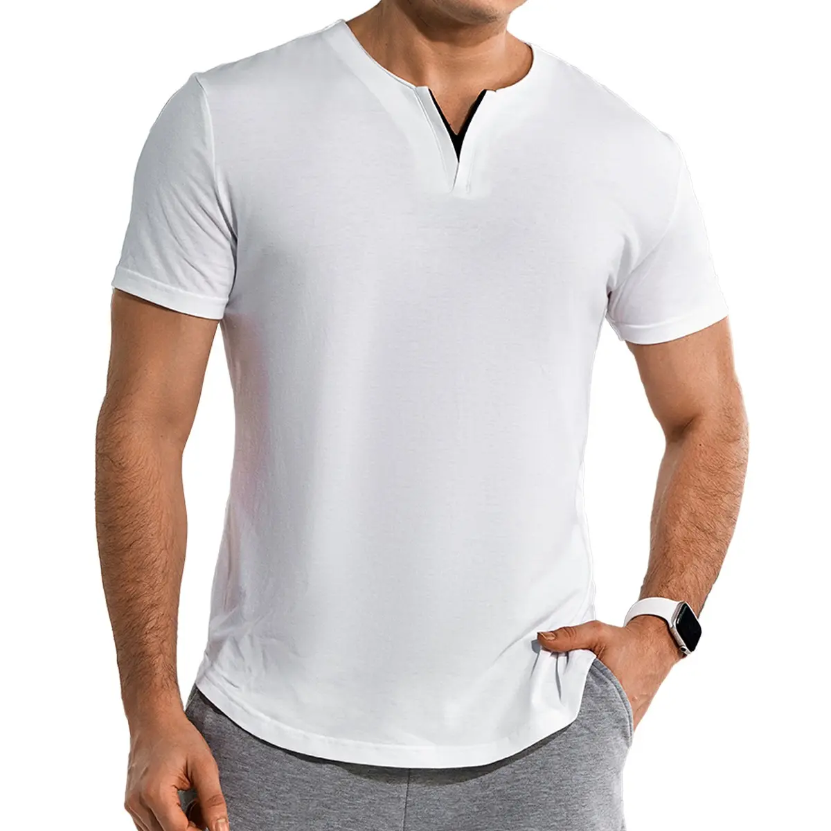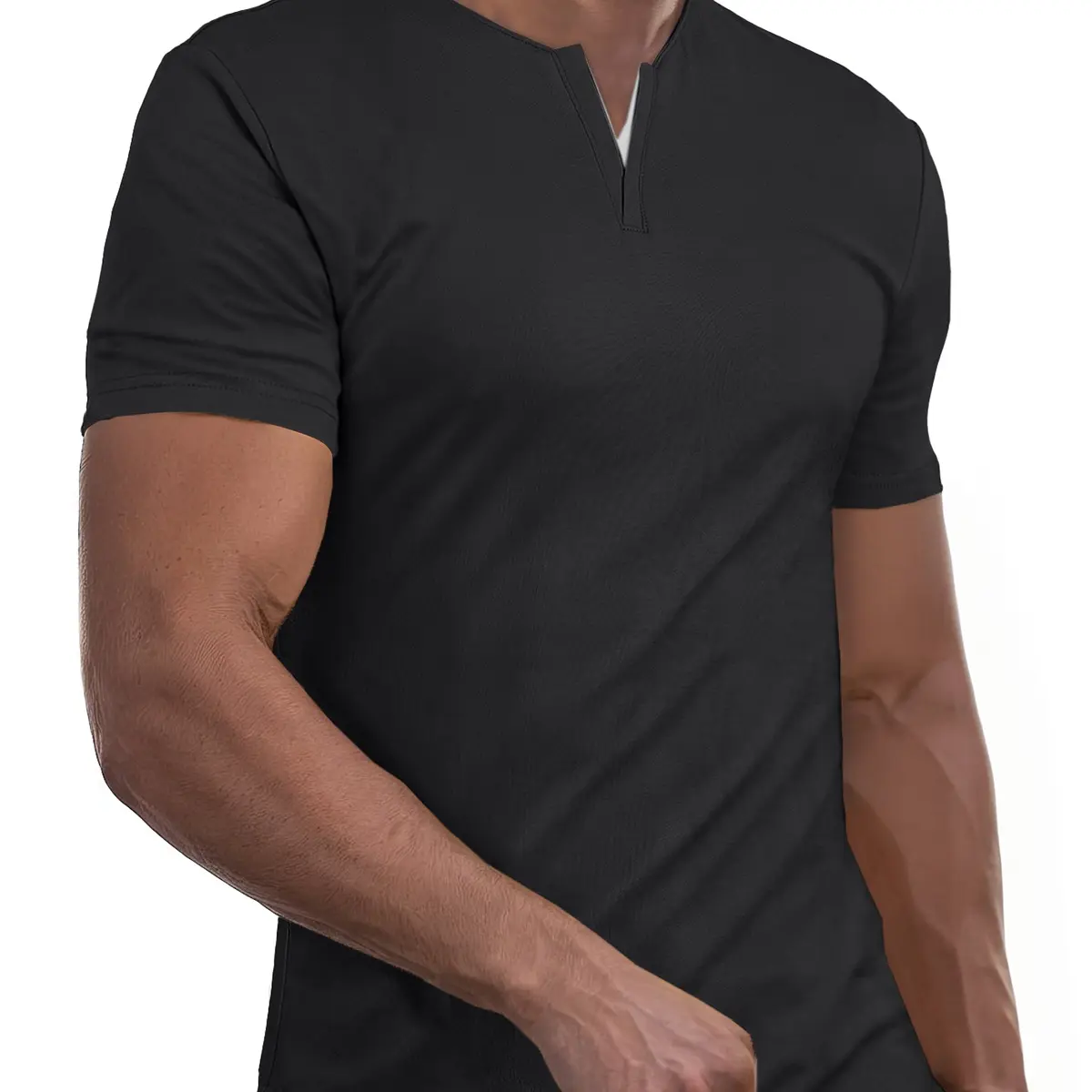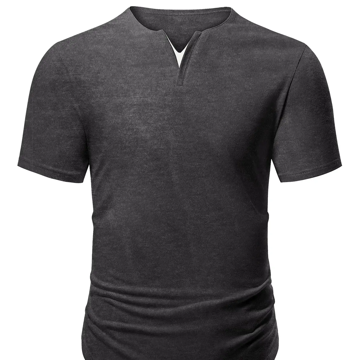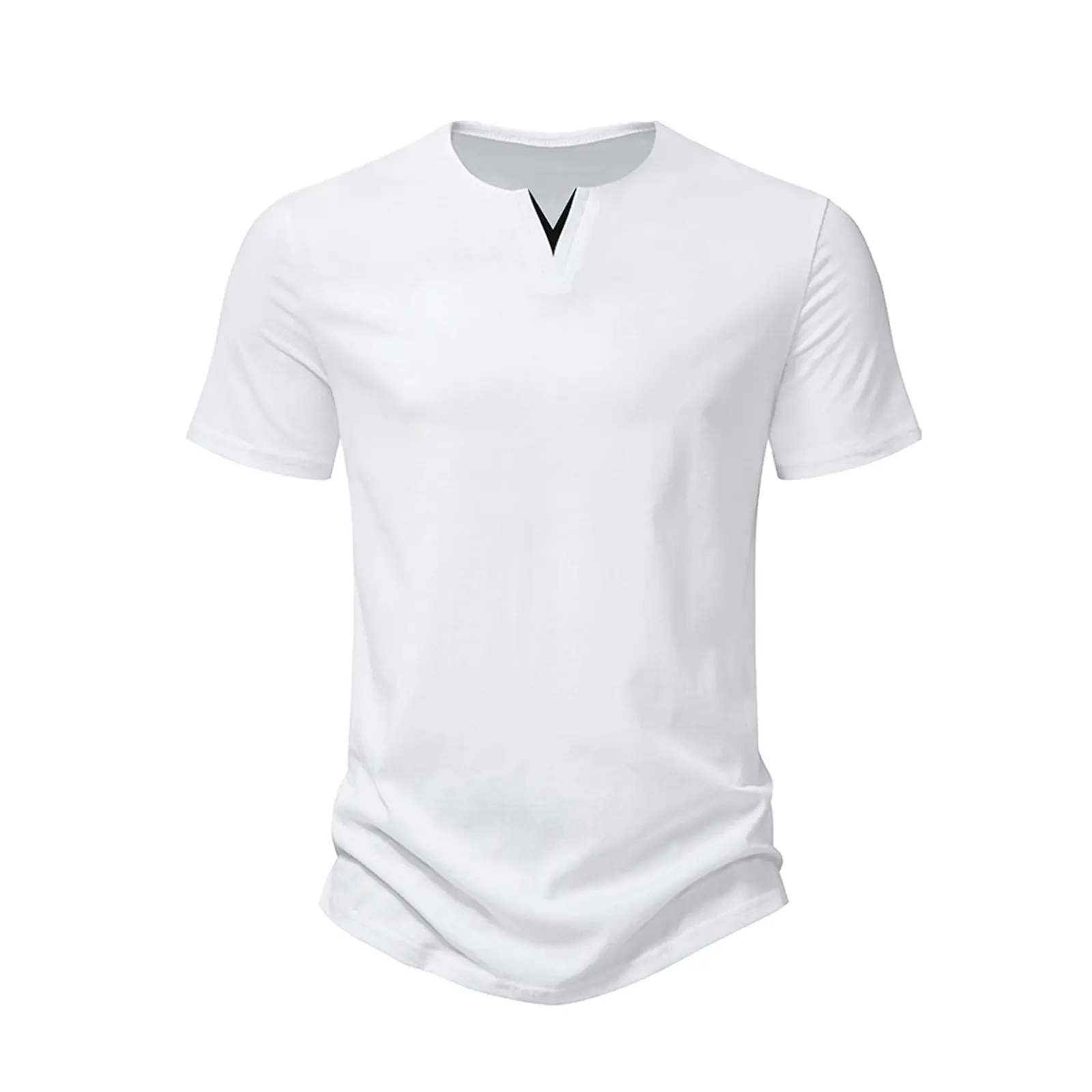 This henley shirt features a slim fit with a V-neck and short sleeves. The solid color and longline cut offer a simple yet fashionable look. The unique front contrasting V-neck design sets it apart. It's a must-have fashion item for your wardrobe. Stay stylish while maintaining a sleek silhouette.