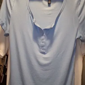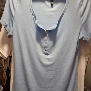 Shirt is significantly more of a very light pale blue in person than the deeper more vivid blue 💙 as pictured in the stock photo. Extremely disappointed.