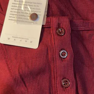 Great material. Comes with spare button. It’s a little shorter than I expected but love it in all the colors I ordered.