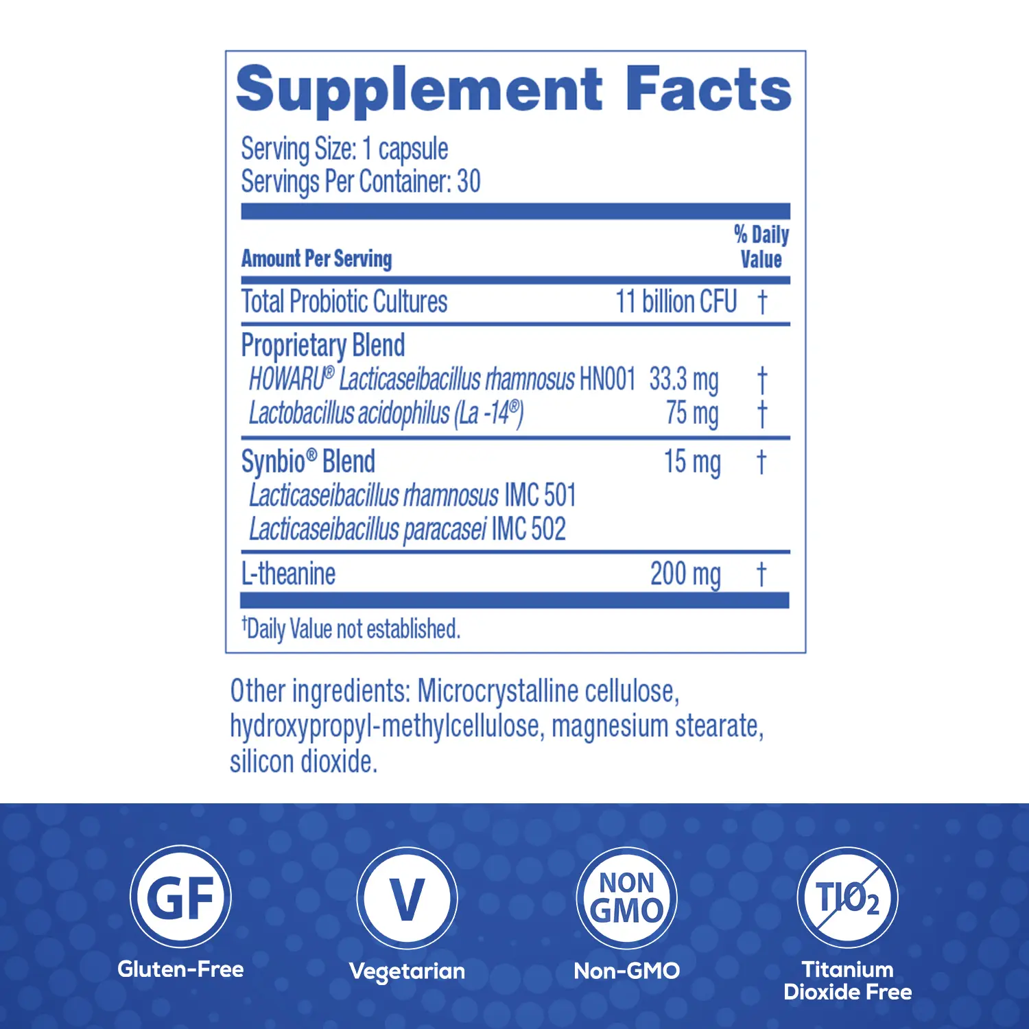 Designed for women, this multi-action formula supports digestive health, vaginal balance, and emotional well-being. With probiotics plus L-theanine, it helps maintain gut comfort, promote a healthy vaginal microbiota, and provide fast-acting stress relief—without drowsiness. Non-GMO, gluten-free, vegetarian, and titanium dioxide-free.