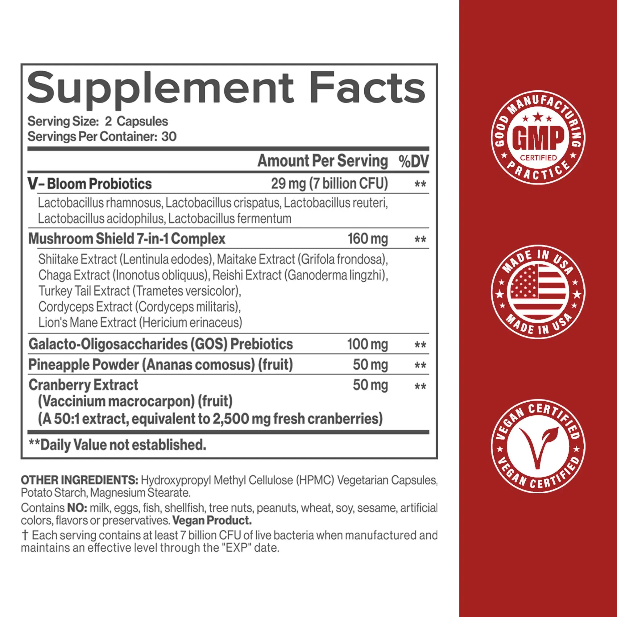 Each serving nutritional value lies in 7 billion CFU of 5 Lactobacillus probiotic strains. It includes 100mg of GOS prebiotics to nourish good bacteria. The formula also features a 7-in-1 mushroom complex with β- and α-glucans, plus cranberry and pineapple extracts for urinary wellness. These ingredients work synergistically to support your health.