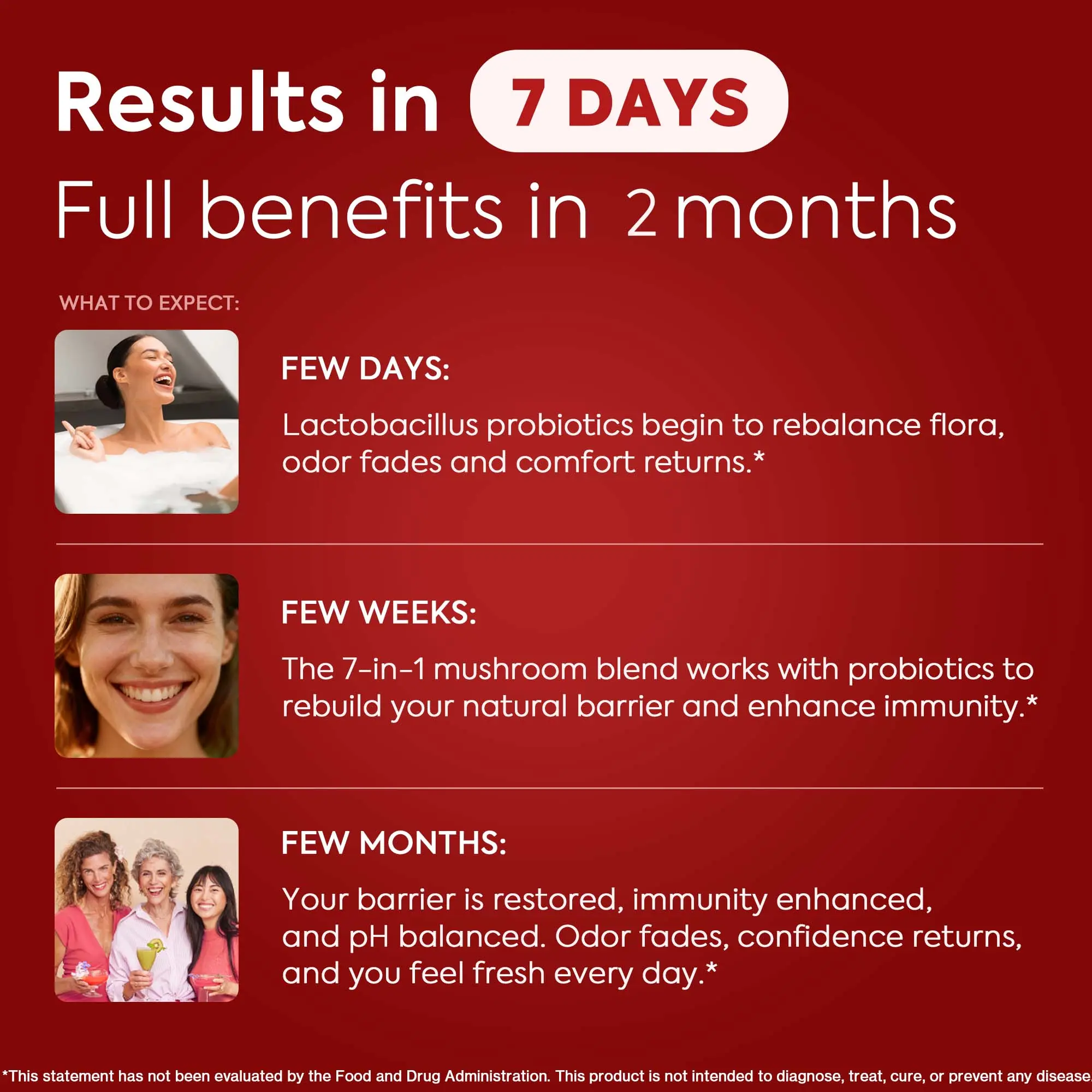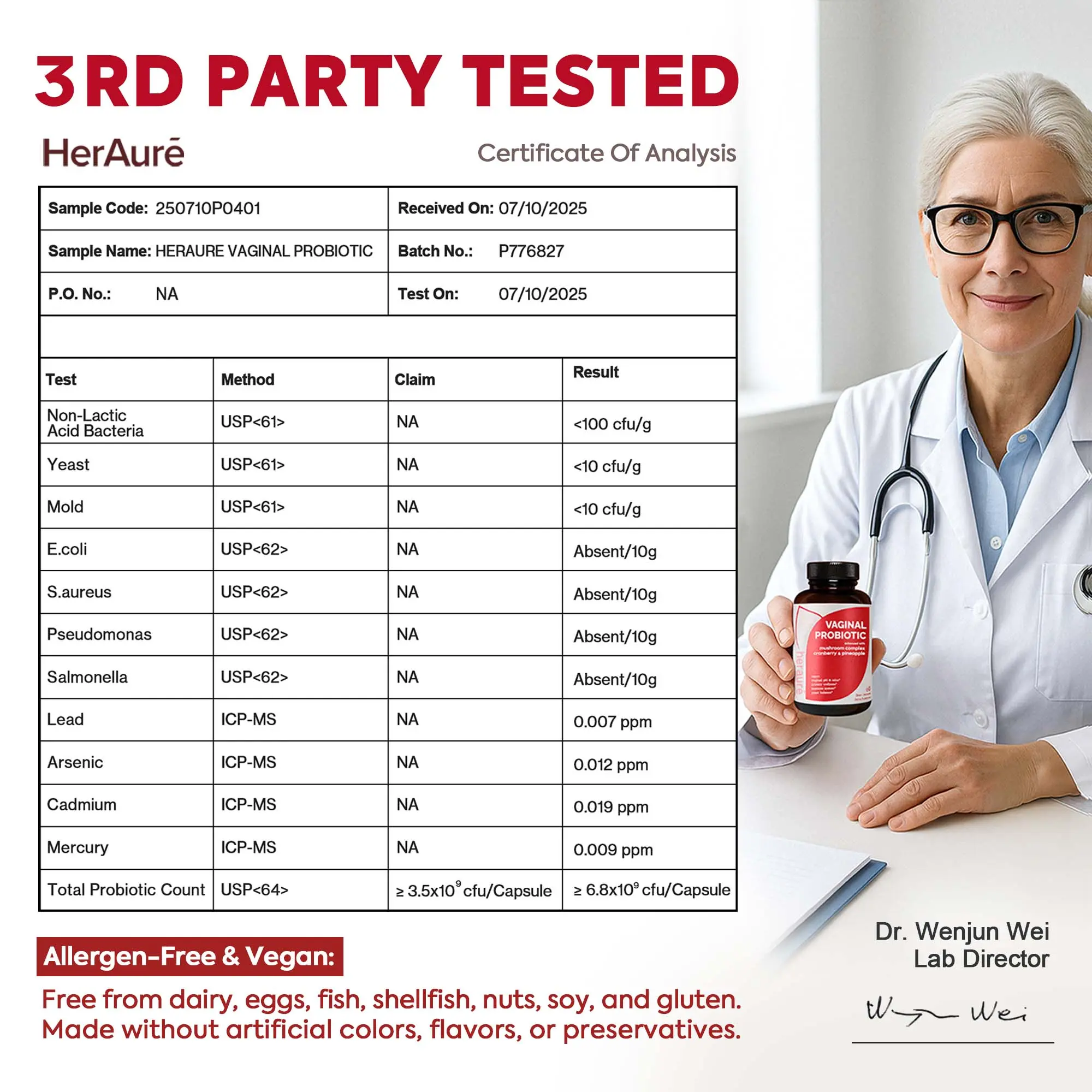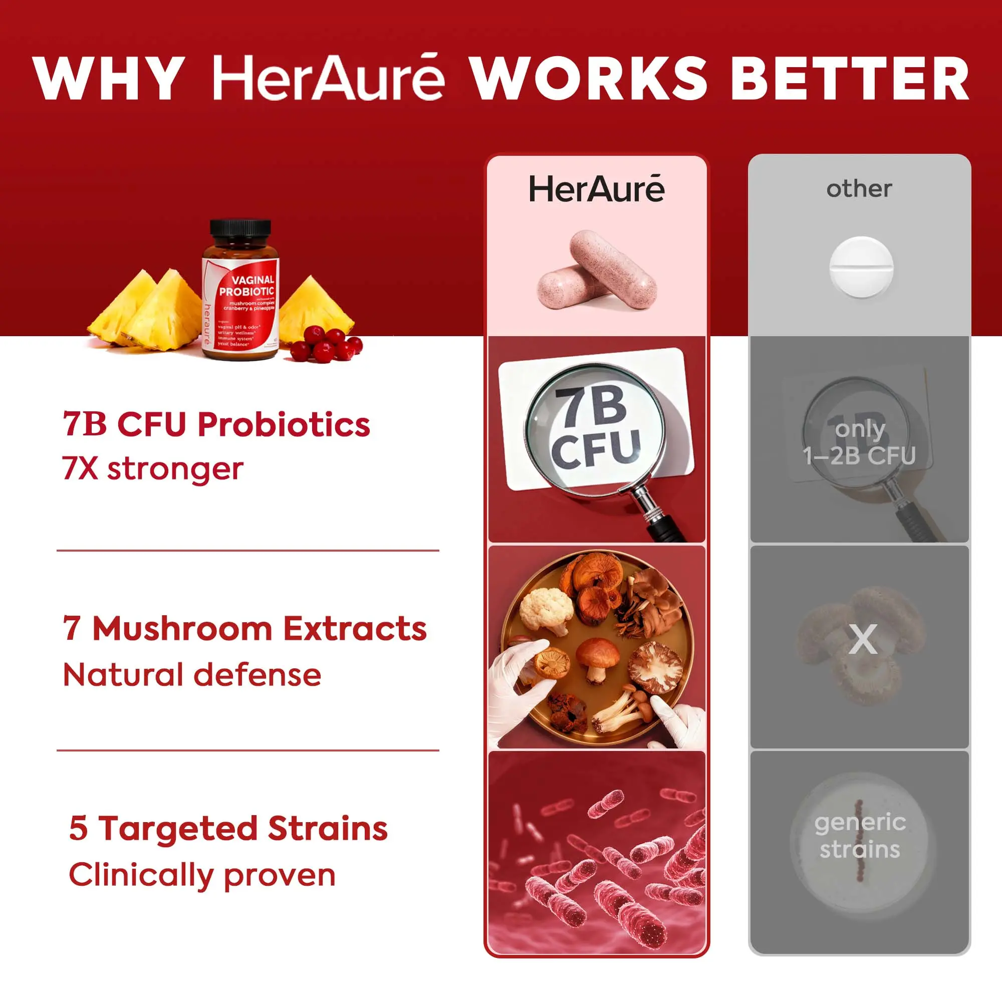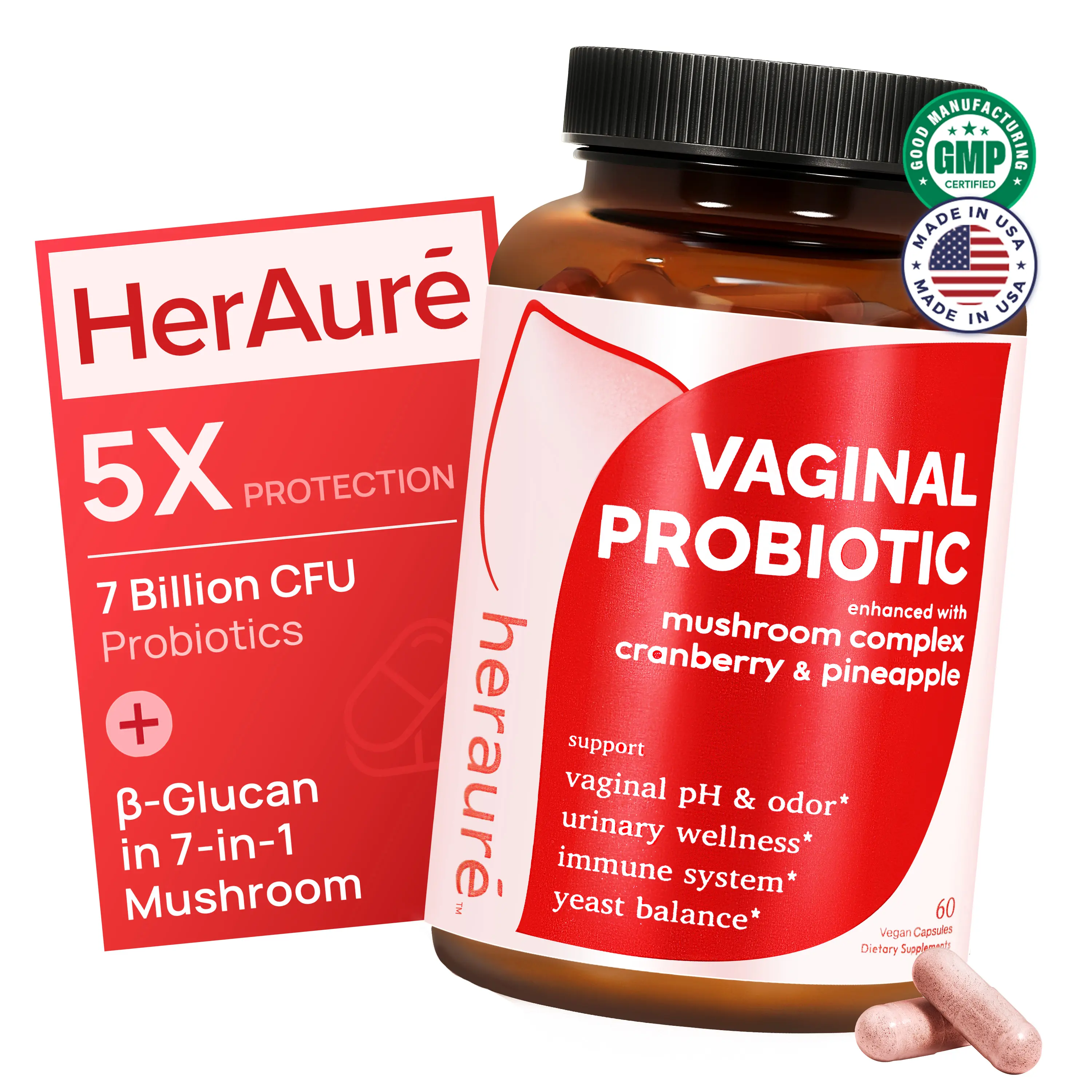 Produced in a factory with GMP certification and FDA registration, HerAuré follows the ISO9001 quality management system. Third-party testing ensures consistent quality and safety. The formula includes five carefully selected Lactobacillus strains and a 7-in-1 Mushroom Complex for enhanced immune response and vag resilience.