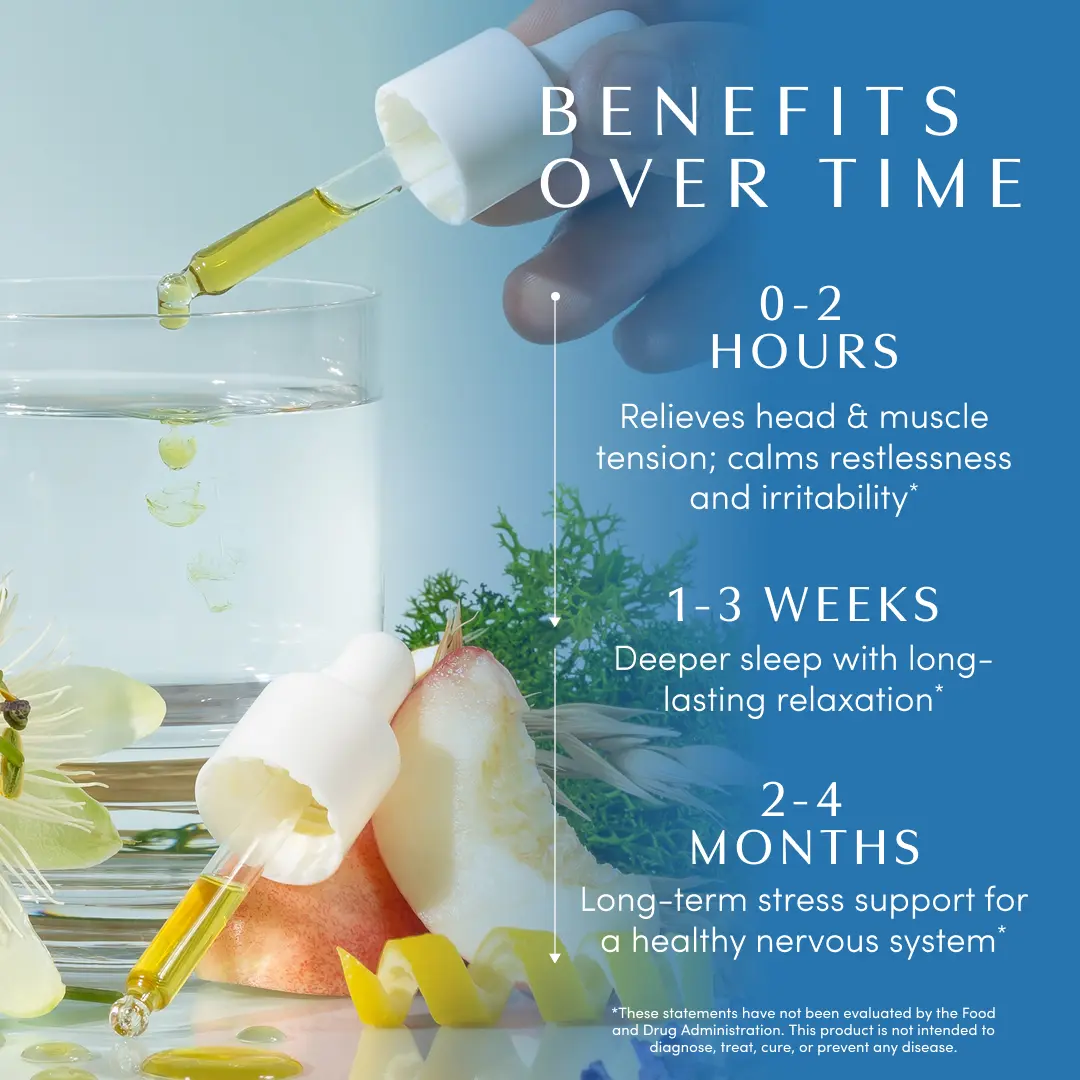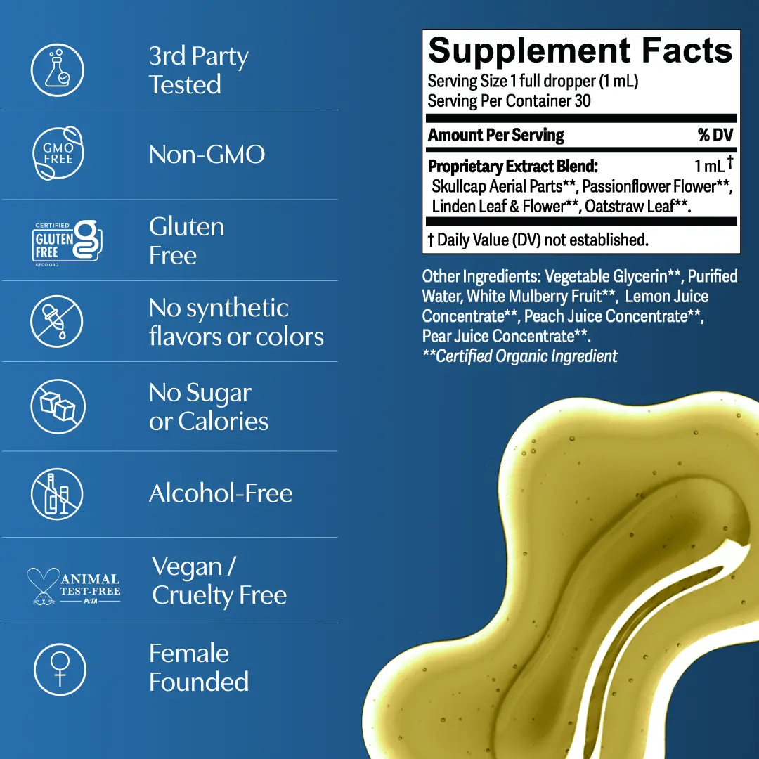 ·Skullcap Aerial Parts**, Passionflower Flower**, Linden Leaf & Flower**, Oatstraw Leaf**, Vegetable Glycerin**, Purified Water, White Mulberry Fruit**, Lemon Juice Concentrate**, Peach Juice Concentrate**, Pear Juice Concentrate****Certified Organic Ingredient