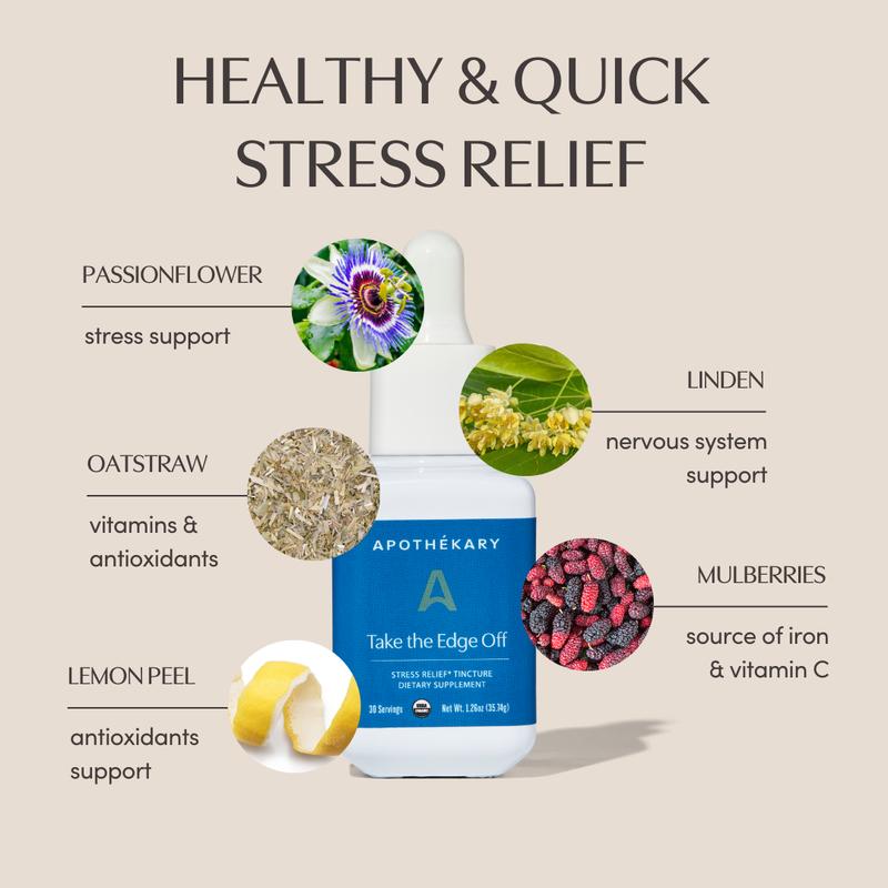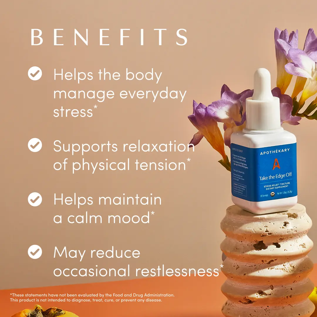 Take the Edge Off by Apothékary is a tincture formulated with powerful nervine herbs which target the nervous system to help calm high stress and ease tension in a moment’s notice.*
