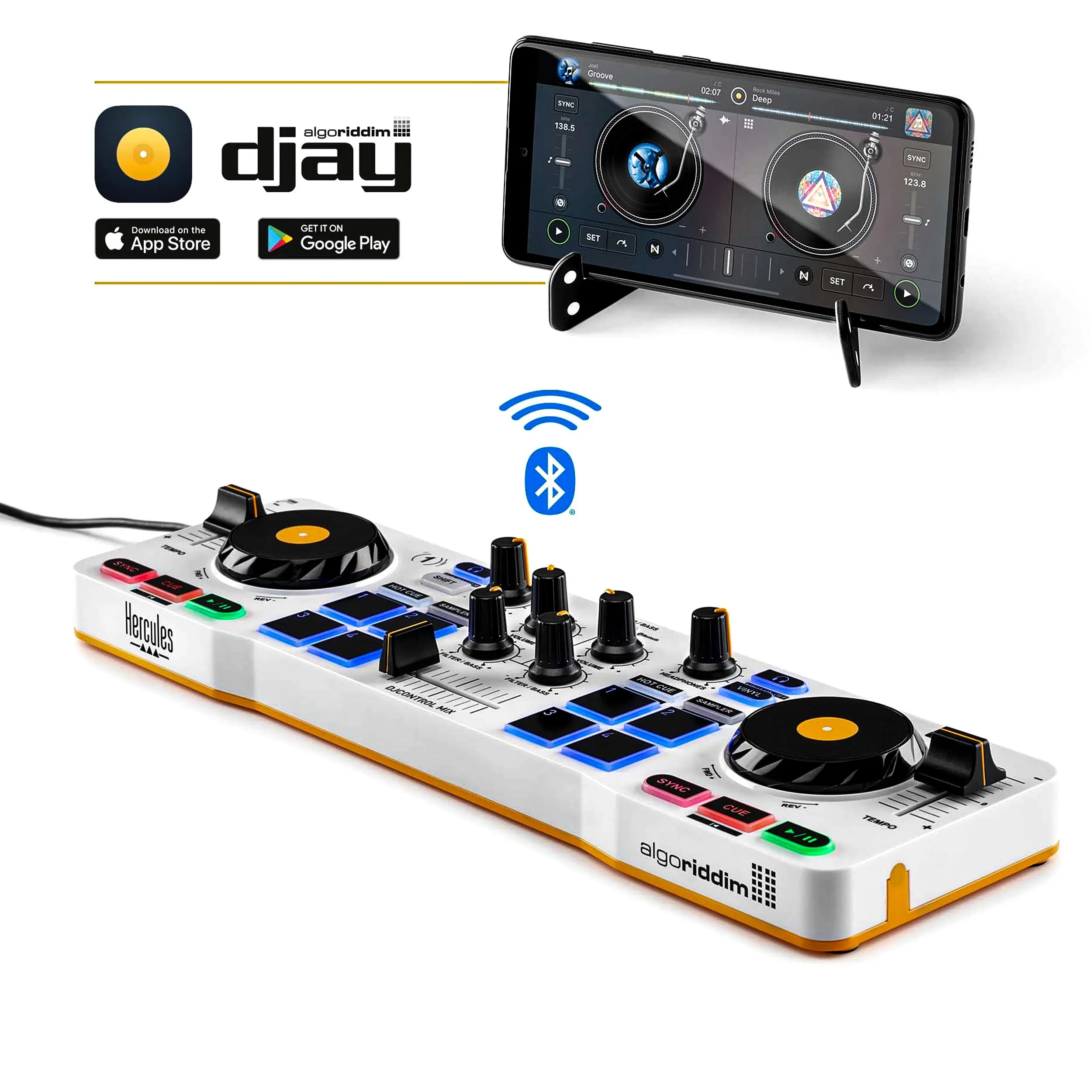 • Controls the djay app available free of charge and for unlimited use on Android and iOS (no need to pay for the app: simply close the pop-up window promoting you to upgrade to djay Pro when the app starts up).