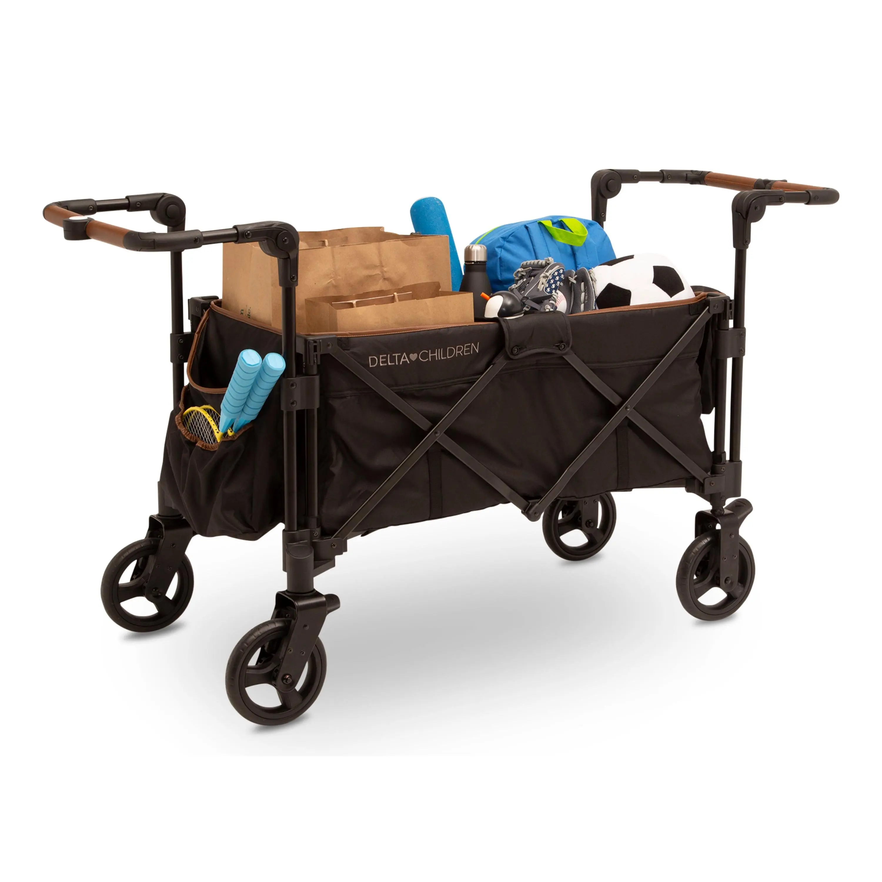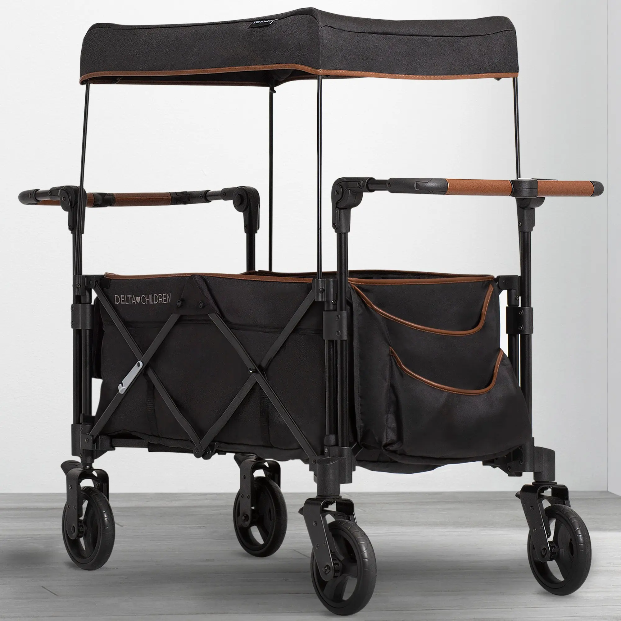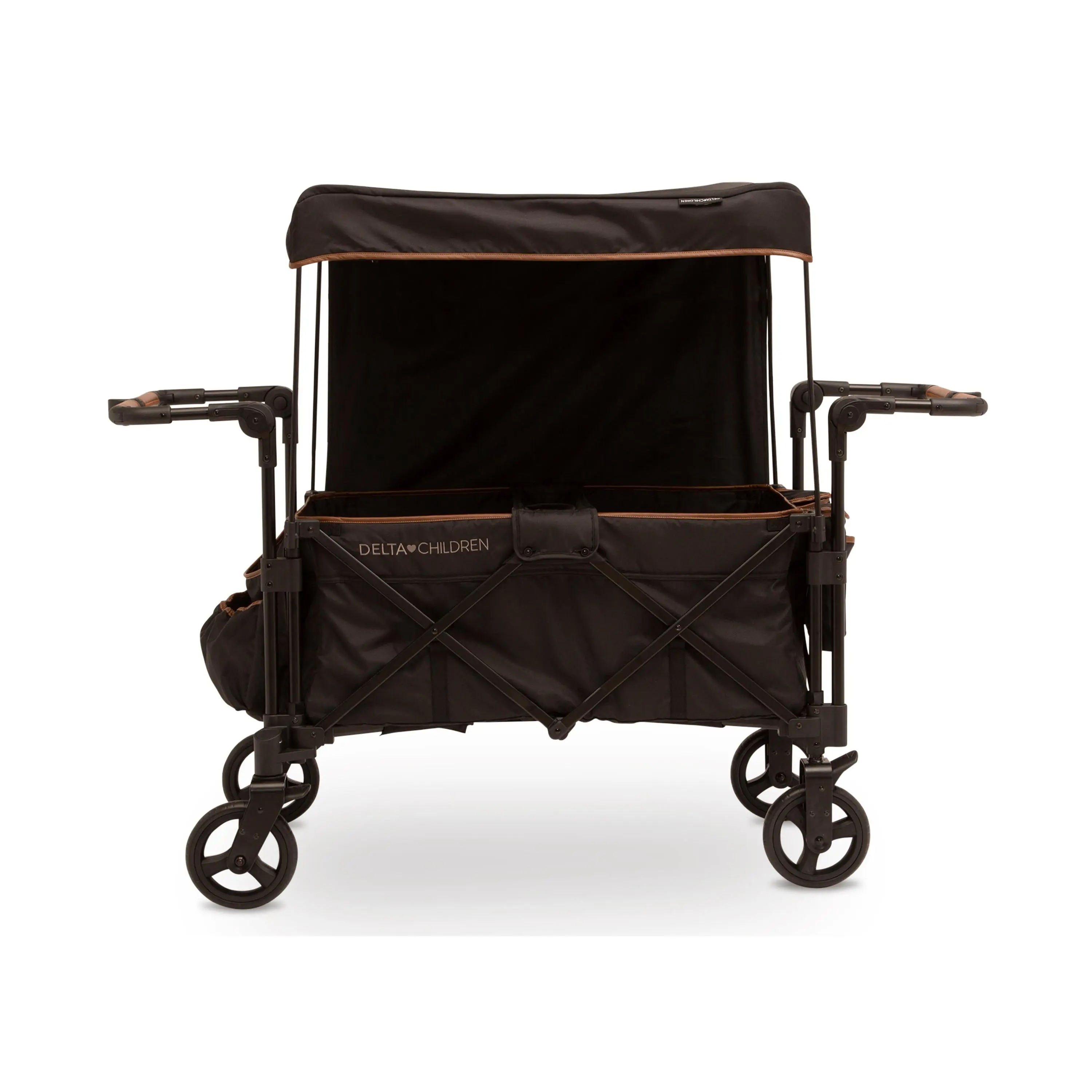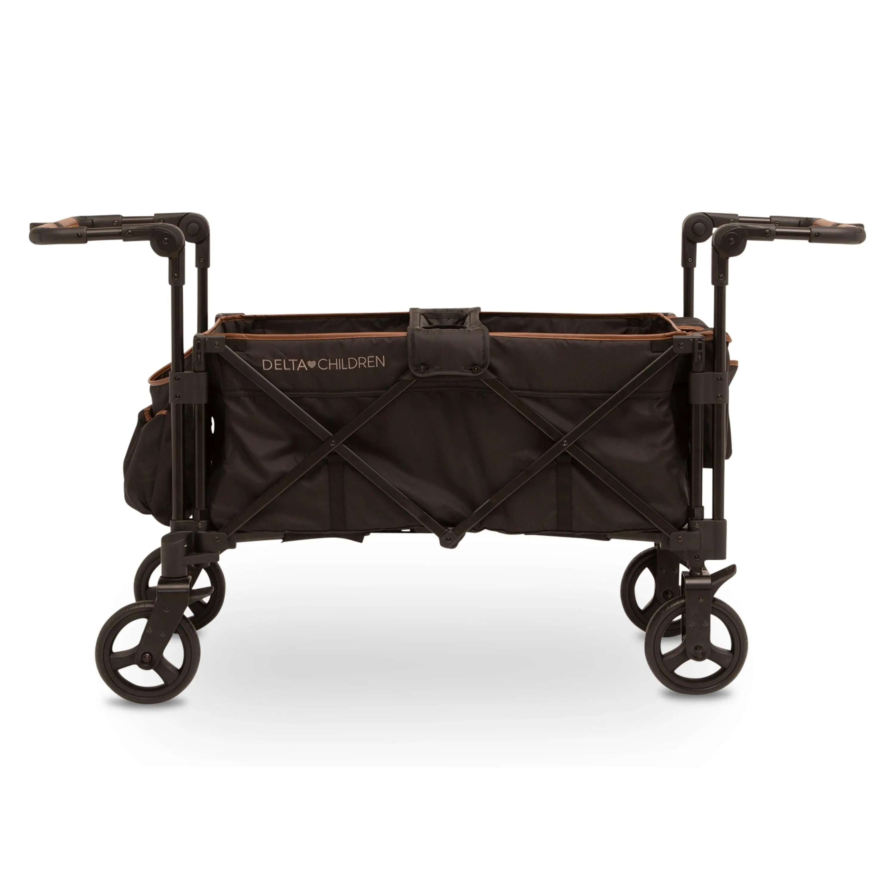 The Hercules Stroller Wagon by Delta Children is specifically designed to grow and flow with your family. Packed with more features than a standard double stroller, this convenient wagon is perfect for indoor or outdoor activities. A comfy option for siblings or friends, this stroller wagon features two cushioned seats with 3-point safety harnesses for security while the removable center console with two cup holders and storage pocket allows kids to share snacks, toys and drinks. An additional cup holder for parents and side pockets ensure you can bring everything you need along for the adventure. The removable, UV blocking canopy and roll-down shades offer privacy and protection from the sun or rain. Easy to drive, it features swivel front wheels that allow you to effortlessly turn and pivot, as well as push and pull handles with adjustable heights. The wagon’s compact fold makes it easy to store or transport. And when your children outgrow the need for a wagon, use it to haul your own gear at the farmers market, while gardening or the grocery store. Holds up to 110 lbs. (55 lbs. per seat). Weighs 36.3 lbs. Recommended for ages 9 months up to 55 lbs.