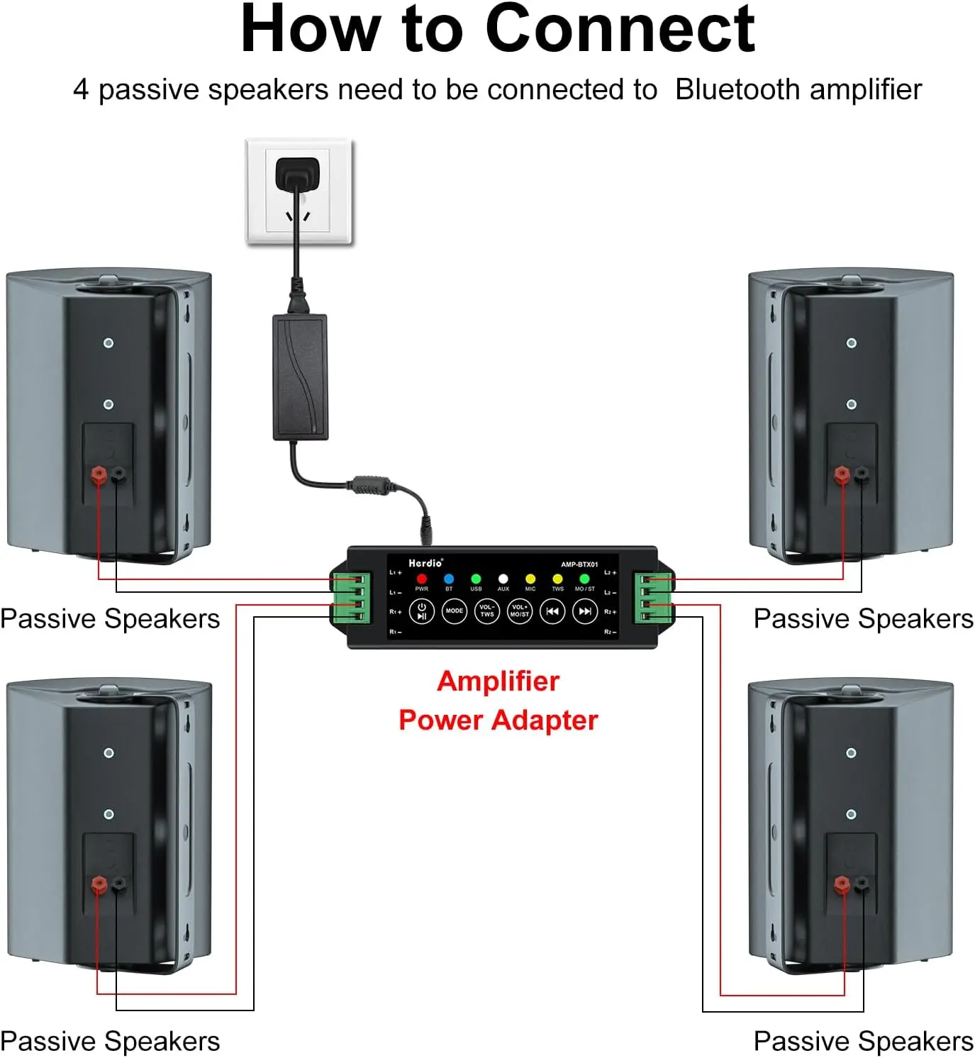 ·【Stable Signal & Advanced Amplifier】Includes 4 passive outdoor speakers with a independent amplifier. Bluetooth Music function allows you connect & Stream AUX(3.5mm) input port plug & play Smartphones and other music devices speaker terminal block. It also has USB, MIC IN, TWS and other functions, powered via Power Adapter Perfect for outdoor/indoor applications