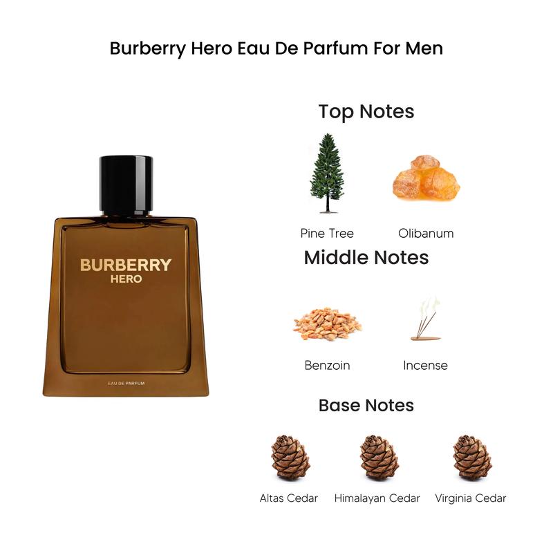 Burberry Hero Eau de Parfum is a bold and sophisticated fragrance that captures the essence of modern masculinity. This scent opens with invigorating pine needles and olibanum, transitions into a heart of rich benzoin and incense, and settles into a warm base of Atlas,