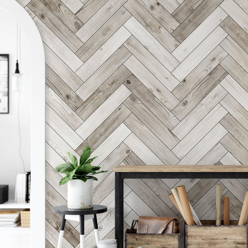 5. Herringbone Whitewashed Barn Wood Planks Mural Wall Art Wallpaper - Peel and Stick