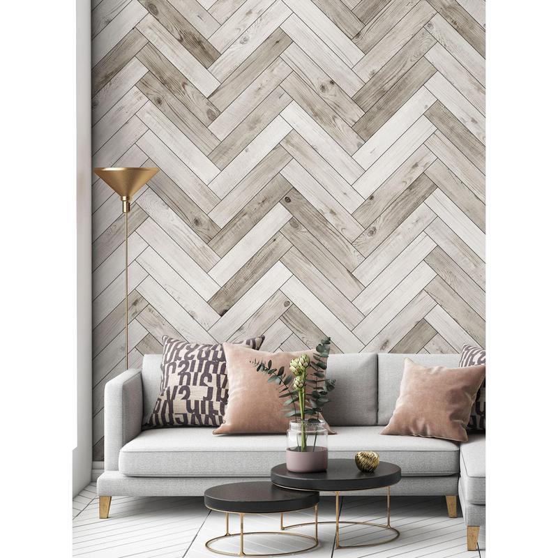 Our Herringbone Whitewashed Barn Wood Planks Mural Wallpaper is stylish neutral design with the textured look of wood grain. Use in any room of the house - or for more unique applications, such as behind a bookcase or the backs of large open shelves.