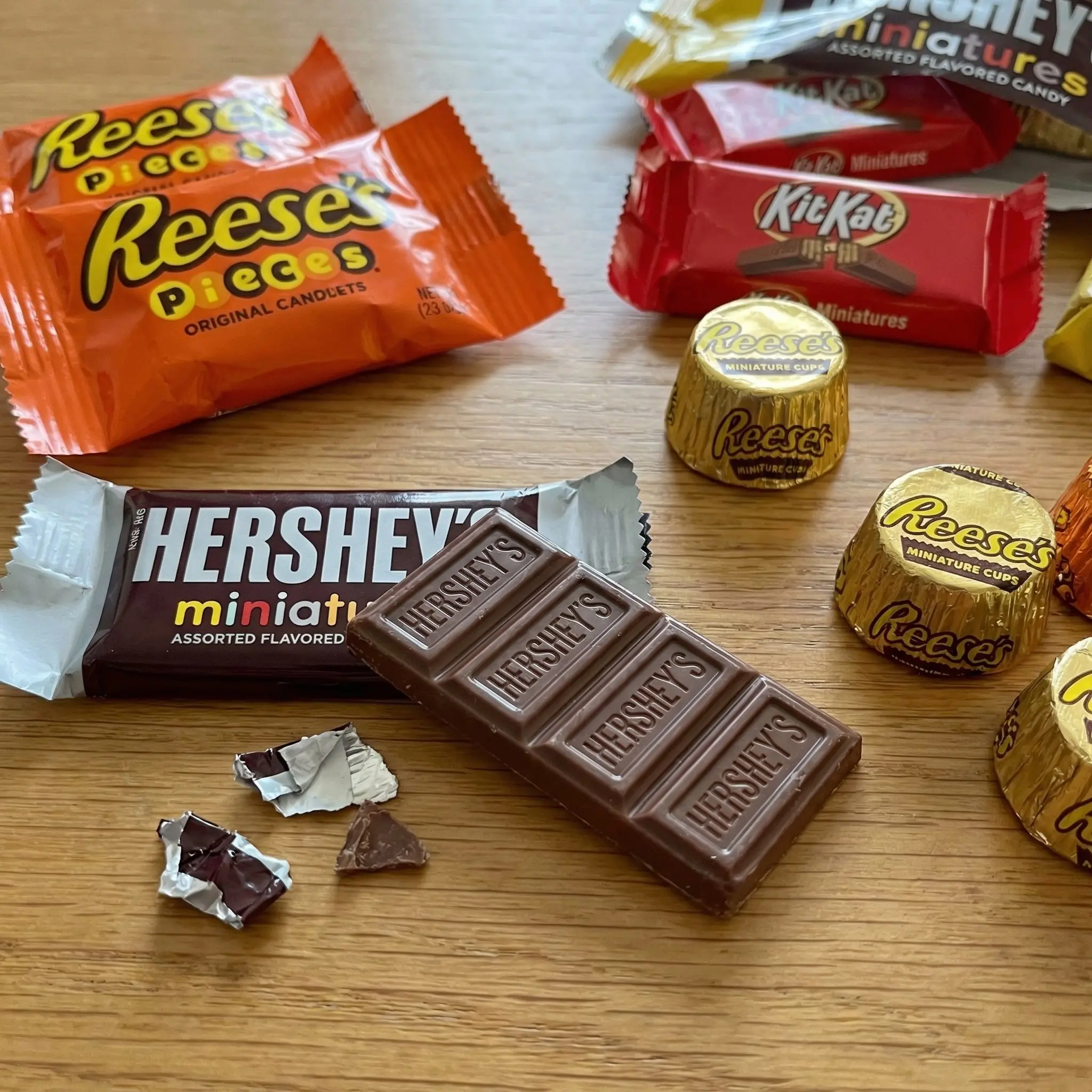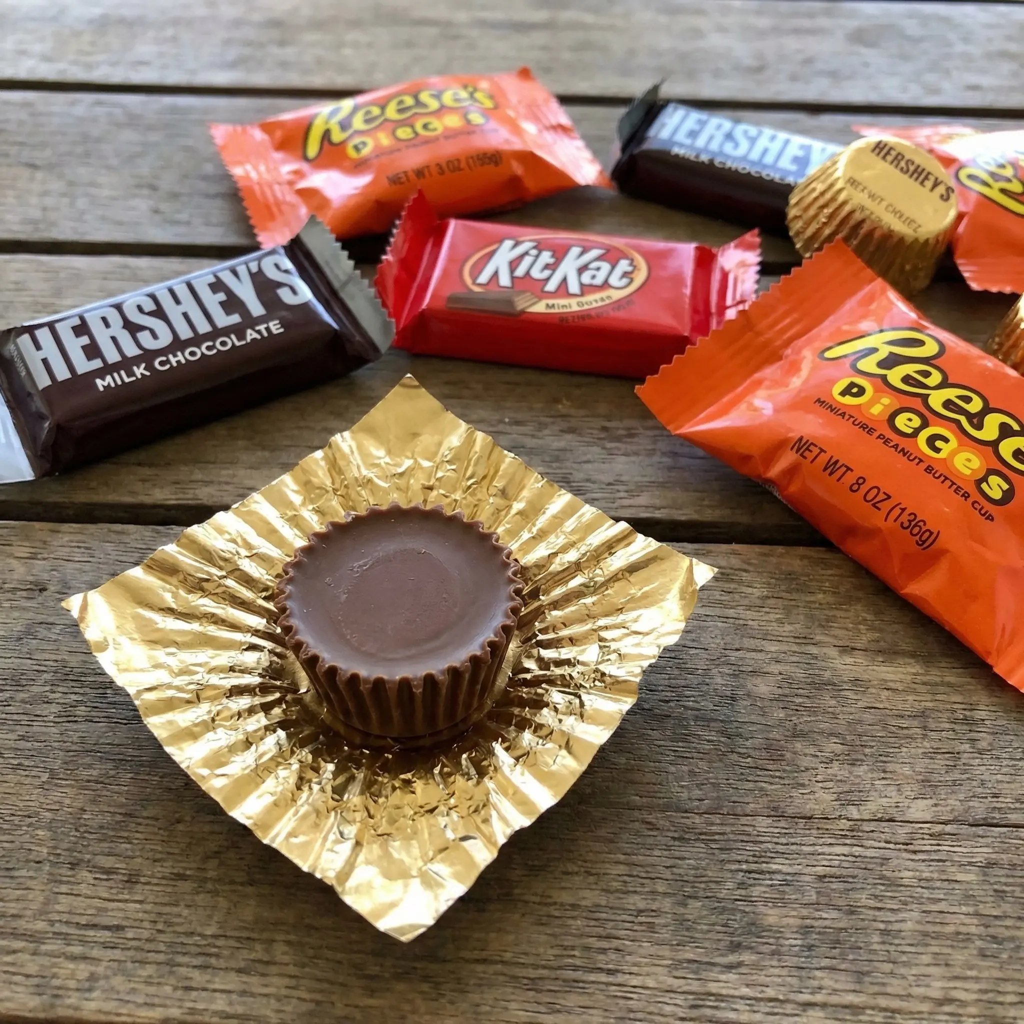 Chocolate Candy. This bulk assortment includes a mix of fan-favorite chocolates featuring KIT KAT, REESE'S Pieces, HERSHEY'S Milk Chocolate, and REESE'S Miniature Peanut Butter Cups.
