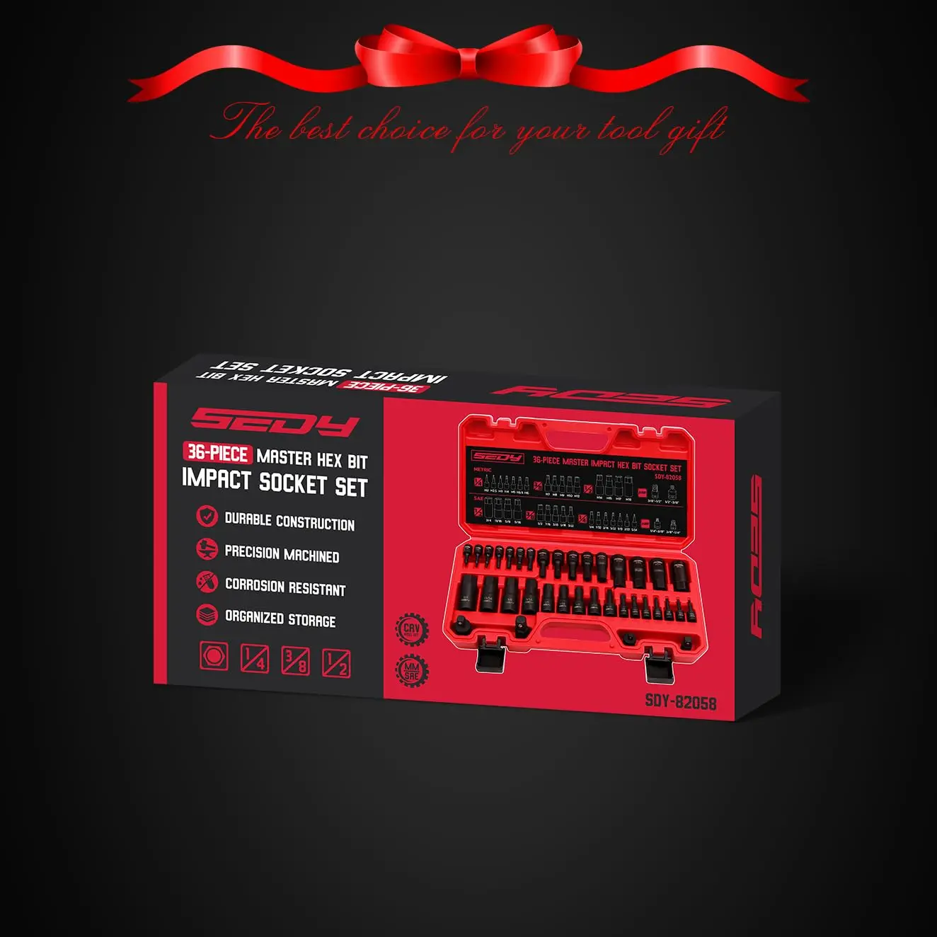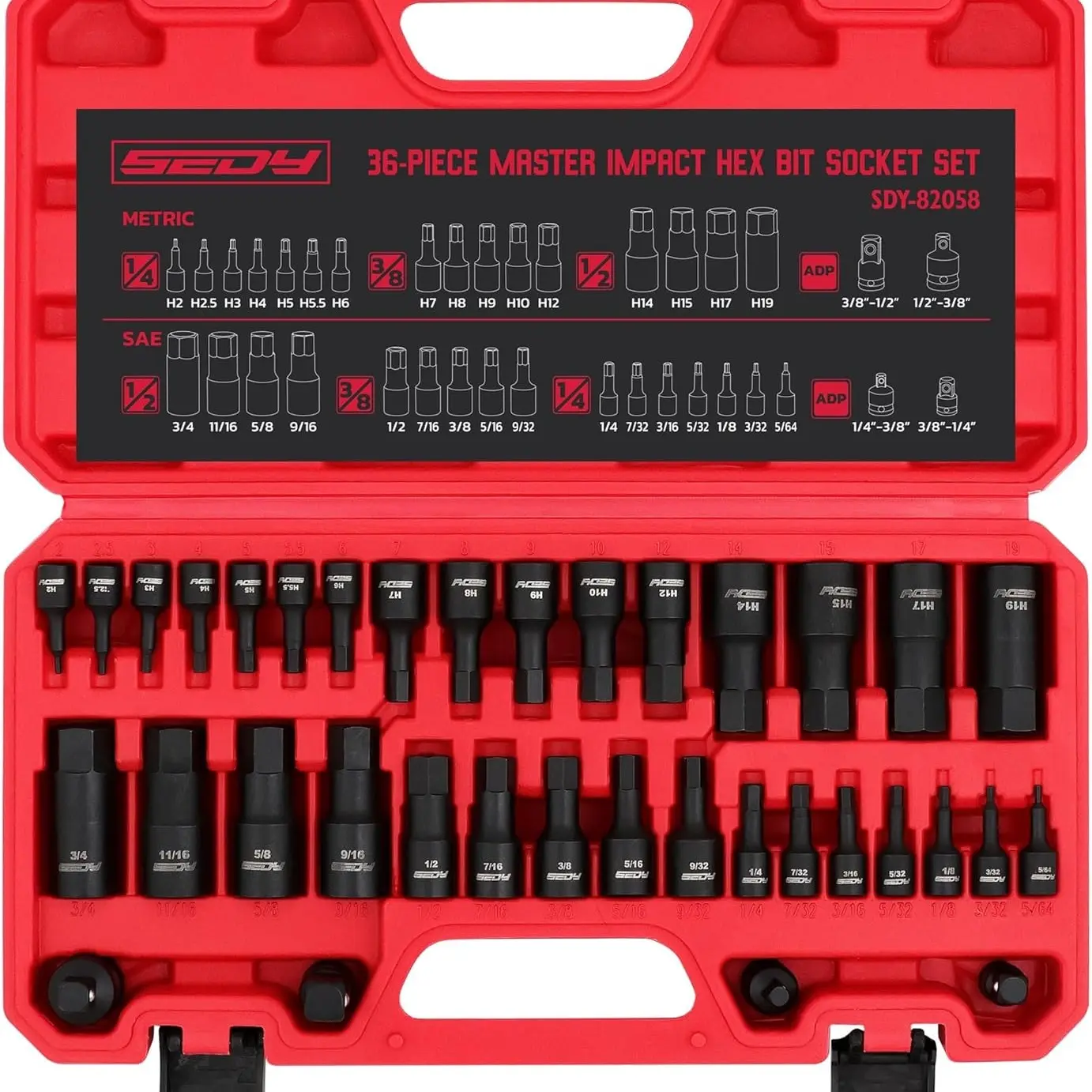 VERSATILE SET - Comprehensive 36-piece hex bit socket set includes 16 pc SAE sockets (1/4" Drive: 1/4", 7/32", 3/16", 5/32", 1/8", 3/32", 5/64". 3/8" Drive: 1/2", 7/16", 3/8", 5/16", 9/32". 1/2" Drive: 3/4", 11/16", 5/8", 9/16".) and 16 pc Metric sockets (1/4" Drive: 2mm, 2.5mm, 3mm, 4mm, 5mm, 5.5mm, 6mm. 3/8" Drive: 7mm, 8mm, 9mm, 10mm, 12mm. 1/2" Drive: 14mm, 15mm, 17mm, 19mm.), plus 4 socket adapters for enhanced versatility. Perfect for automotive, mechanical, offering precision and adaptability.