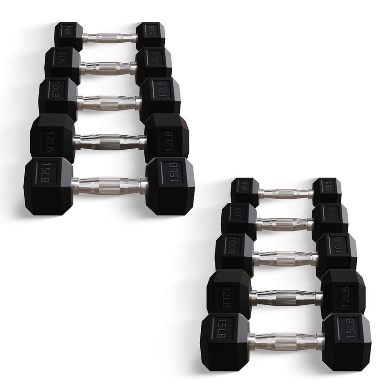 Discover the ideal addition to your workout arsenal with the BalanceFrom Signature Rubber-Encased Hex Dumbbell Set.Whether you're a fitness enthusiast or a beginner, dumbbells are essential for a multitude of exercises targeting various muscle groups. Crafted with high-quality solid cast iron and encased in durable rubber, these dumbbells are built to withstand the test of time, ensuring longevity for both your equipment and your floors. Designed for comfort and functionality, each dumbbell features solid metal chrome finish contoured handles. These ergonomically shaped handles are meticulously crafted to fit comfortably in your hand, allowing for a seamless and comfortable grip throughout your workout. Additionally, the textured handle surface provides enhanced traction, giving you a secure hold even during the most intense training sessions.Say goodbye to the hassle of unstable dumbbells with our hexagon-shaped rubber-encased heads. This innovative design not only prevents rolling but also facilitates convenient storage between sets. Whether you're performing lunges, curls, or presses, you can trust that your dumbbells will stay in place, allowing you to focus on perfecting your form and maximizing your results.Whether you're looking to enhance your home gym setup or stock your commercial facility, the BalanceFrom Signature Rubber-Encased Hex Dumbbell Set offers unparalleled quality and versatility.