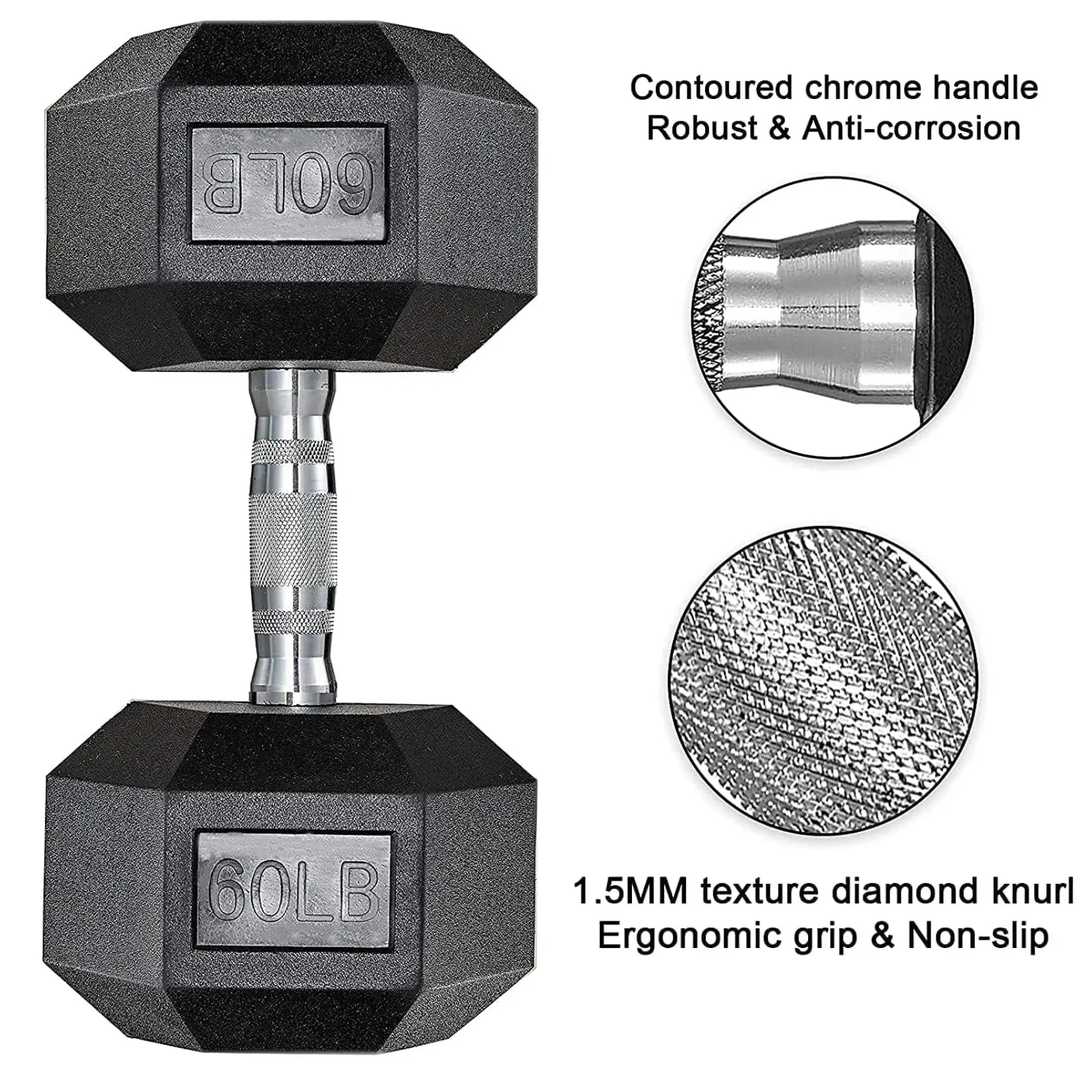 The hexagonal dumbbell design prevents rolling on the floor and ensures stability on the dumbbell rack. The ergonomic knurled handle enhances grip, helping you hold the dumbbell securely without slipping.