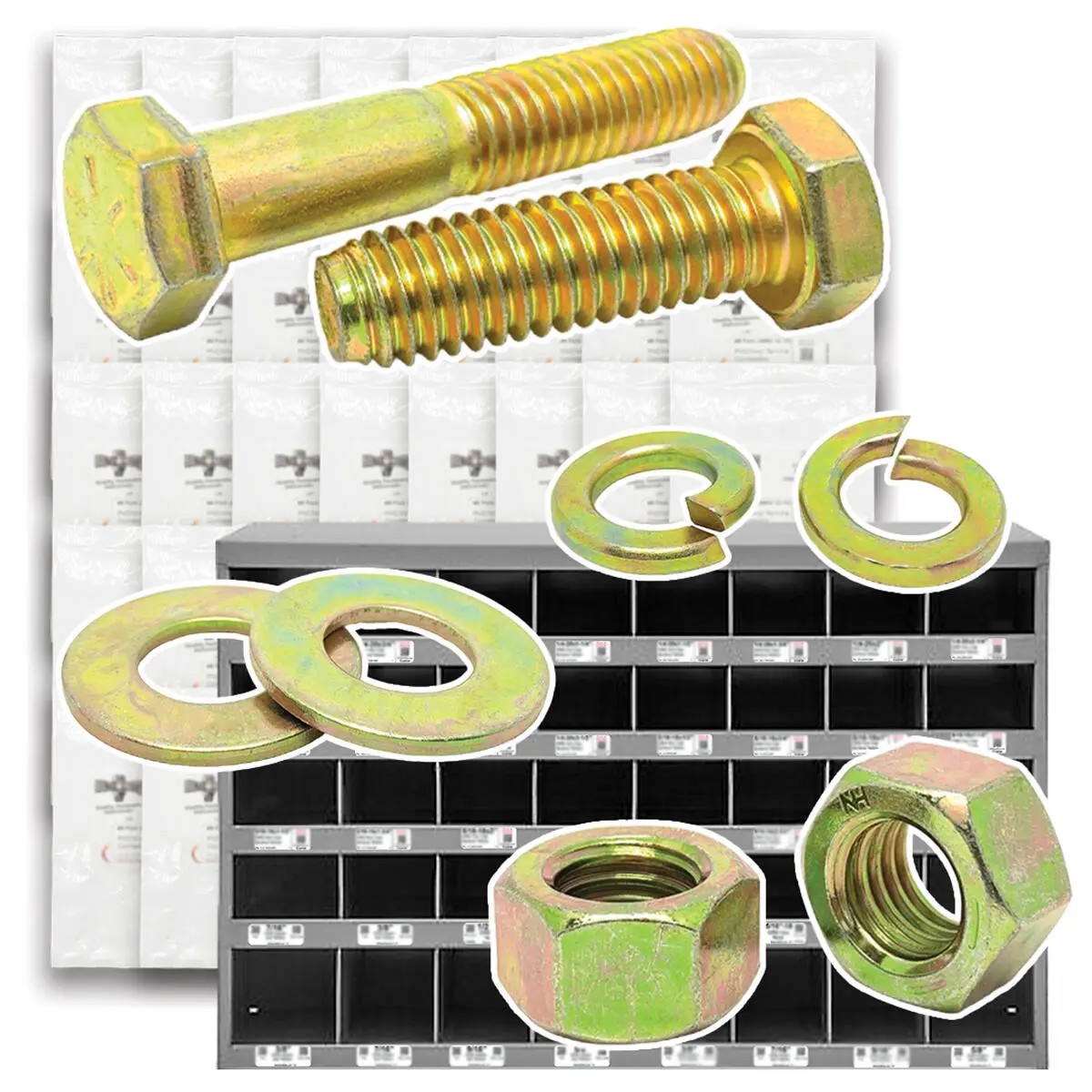 Bolt Information: Grade 8 Hex Head Cap Screws ASME B18.2.1 Zinc YellowNut Information: Grade 8 Finished Hex Nuts ASME B18.2.2 Zinc YellowWashers Information: Grade 8 SAE Flat Washers Zinc Yellow Alloy Grade 8 Split Lock Washers Zinc YellowContainer Information: 1 - Heavy Duty 40 Hole Steel Bin. (Powder Coated Durable Gray Finish) Products individually labeled and poly bagged.*Please note the bin will ship & arrive separately from the fasteners.
