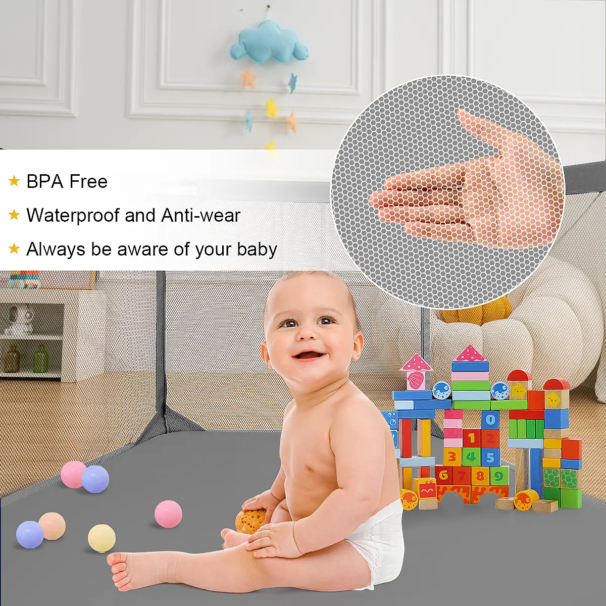 ·The multi-mesh design allows you to watch your baby's every move. It prevents dangerous postures and ensures your baby sees your figure while playing. 🌟