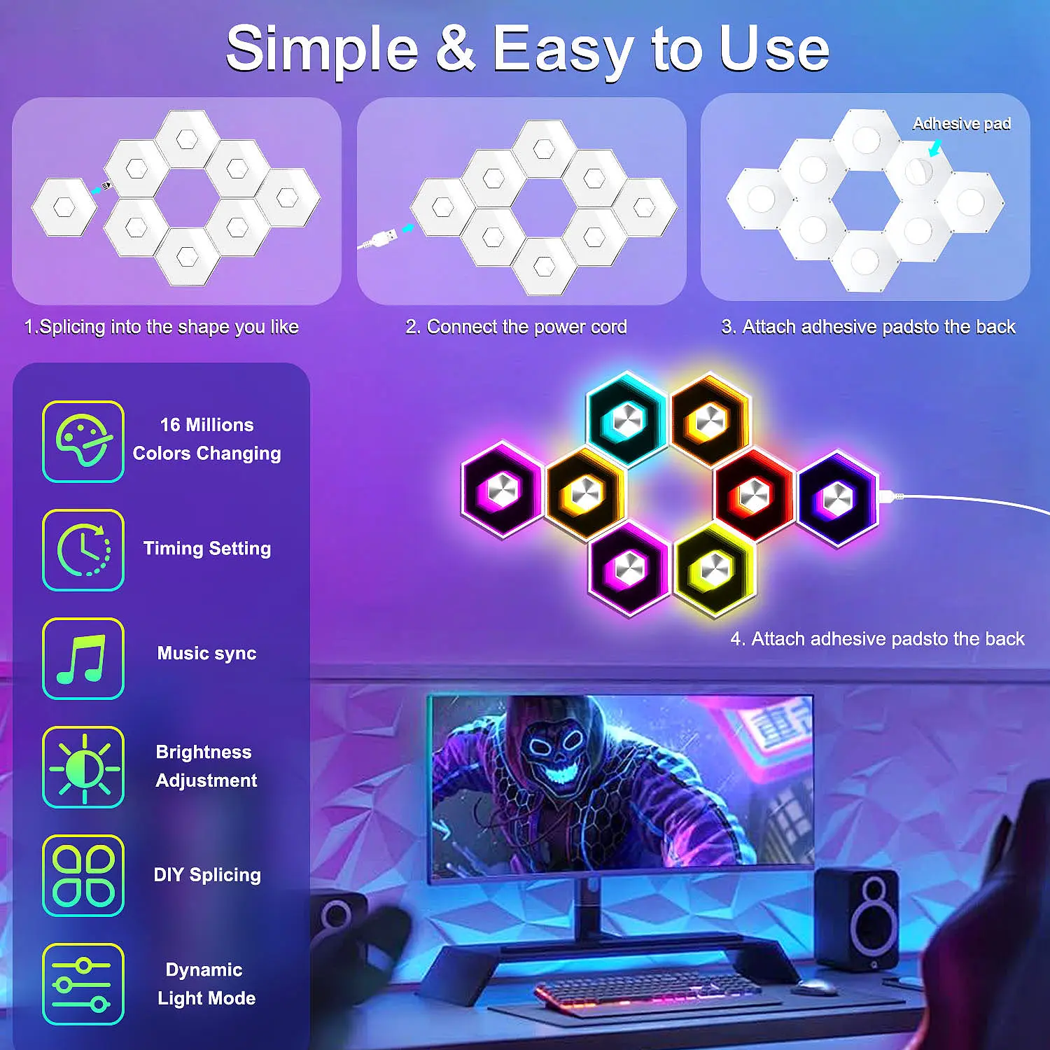 Music Sync 🎵🎶- Voice-activated induction turns on the microphone mode.- The light "beats" with the rhythm of the music, creating a synchronized experience.- The lights interact with the music, turning the room into a dance floor.- Choose the lighting and music style that suits you.- The hexagonal wall lamp receives the frequency of music, clapping, and voice, changing colors.