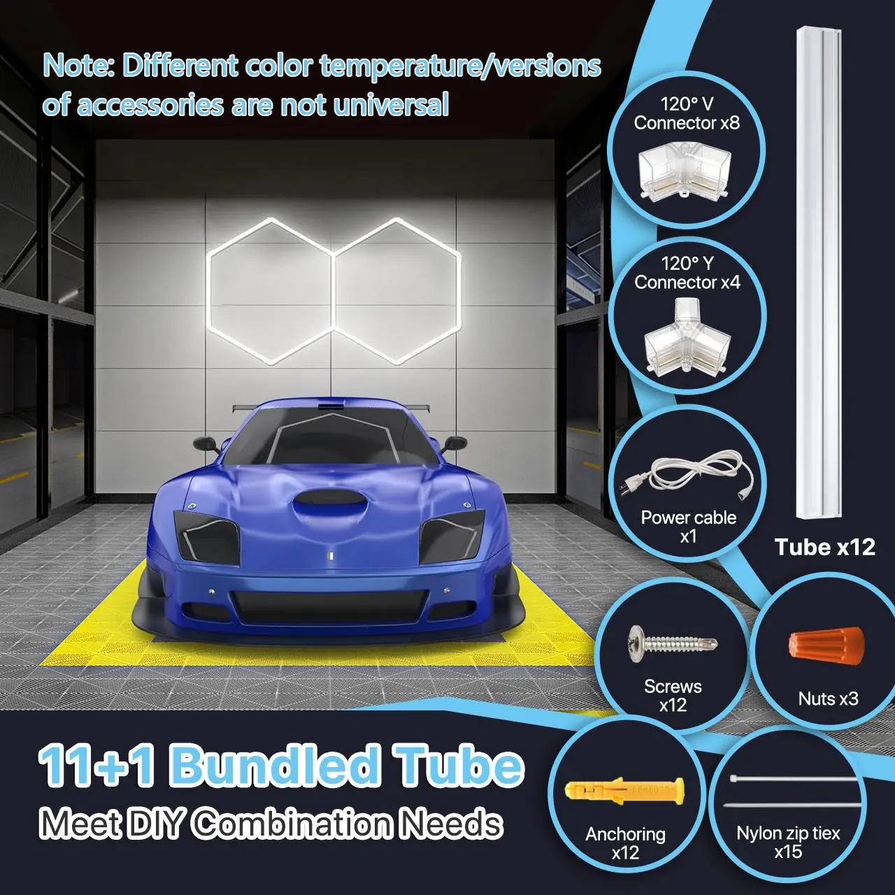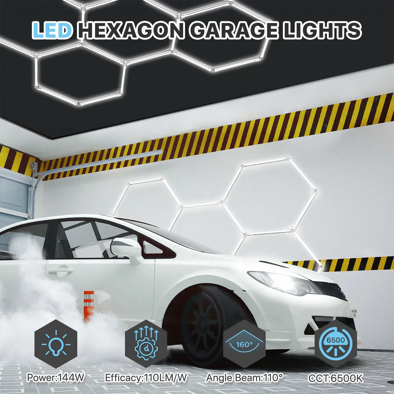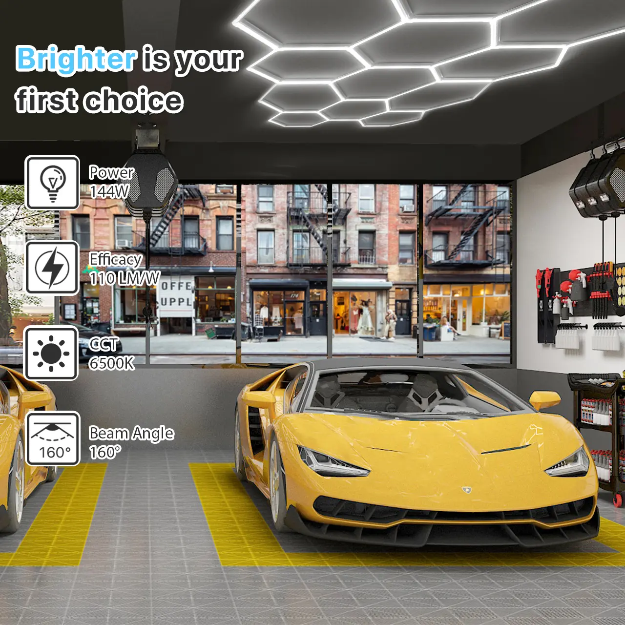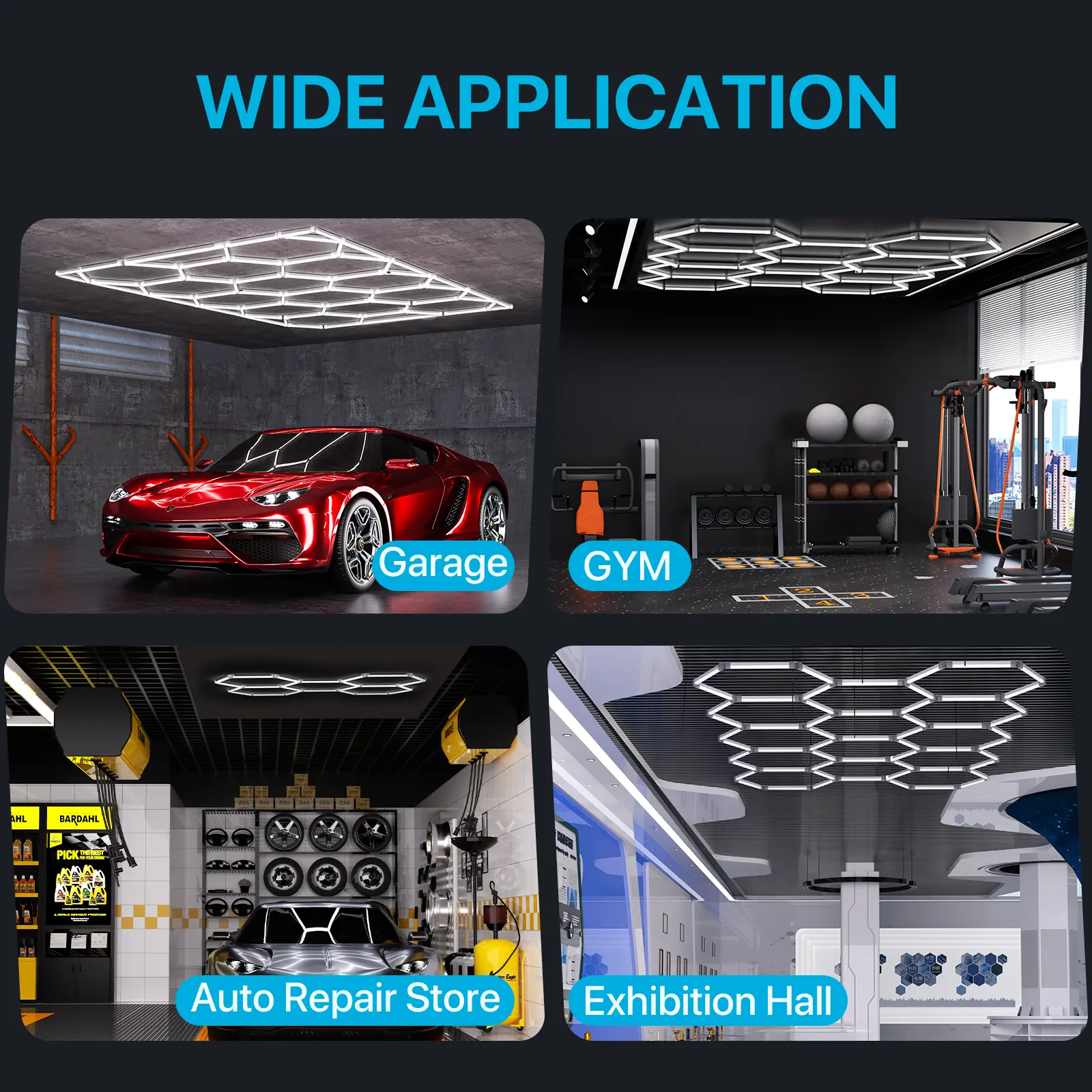 Ultra Bright: These HYPERLITE hexagonal garage lights provide a powerful light output in different grades, with 3960 lumens, 7269 lumens, 9900 lumens, 15840 lumens, 30360 lumens, 38280 lumens, and 54780 lumens, providing superb brightness for the garage or workspace. 6500K Cold White color temperature ensures clear and bright illumination ideal for tasks such as auto detailing, workshop activities, or gym workouts. activities or gym workouts, among other tasks.