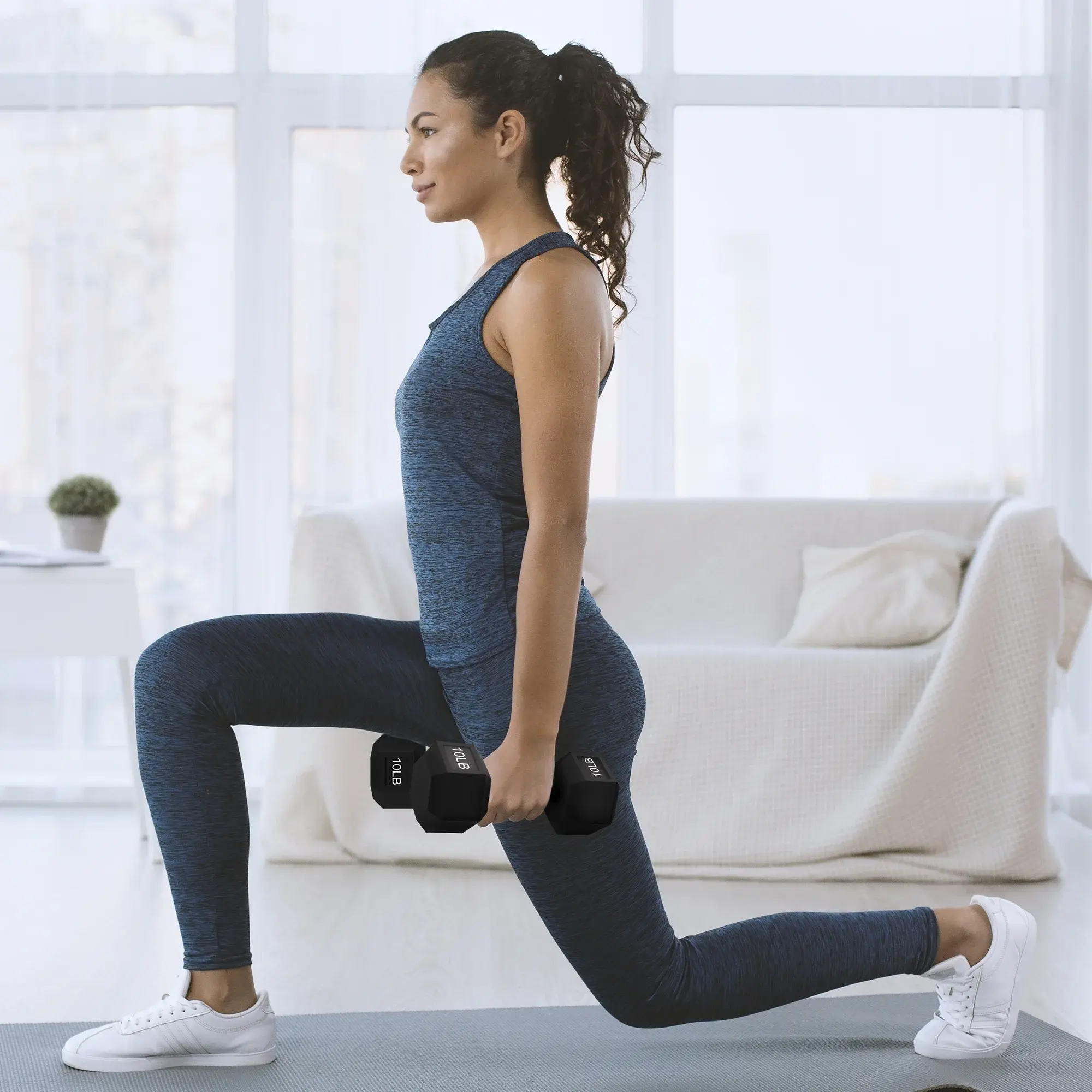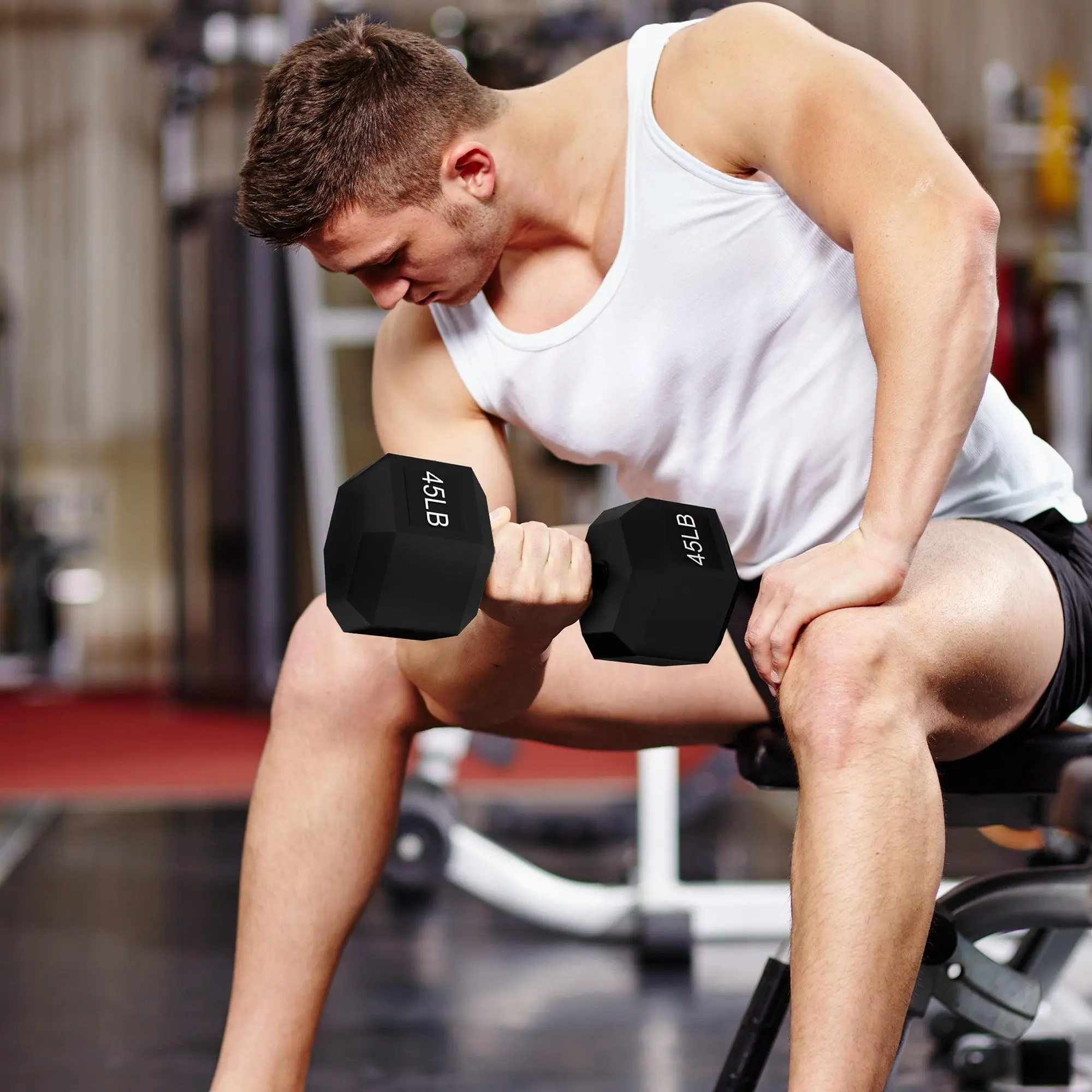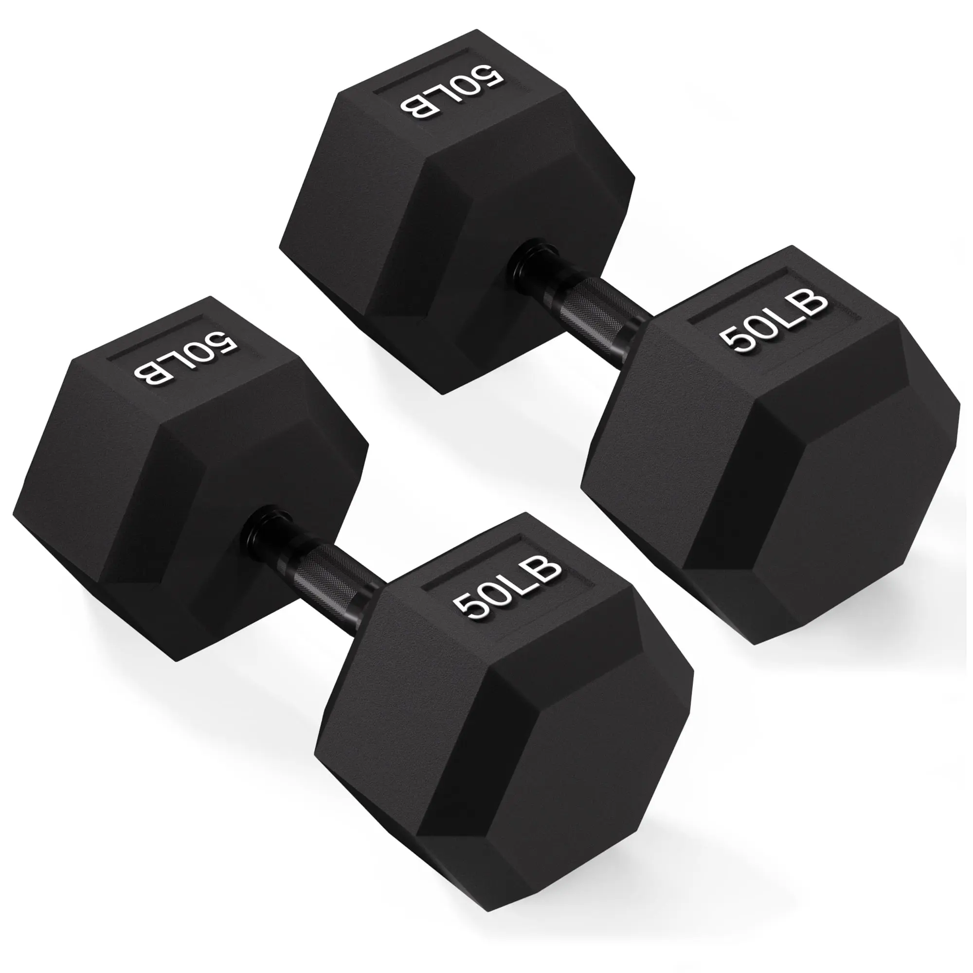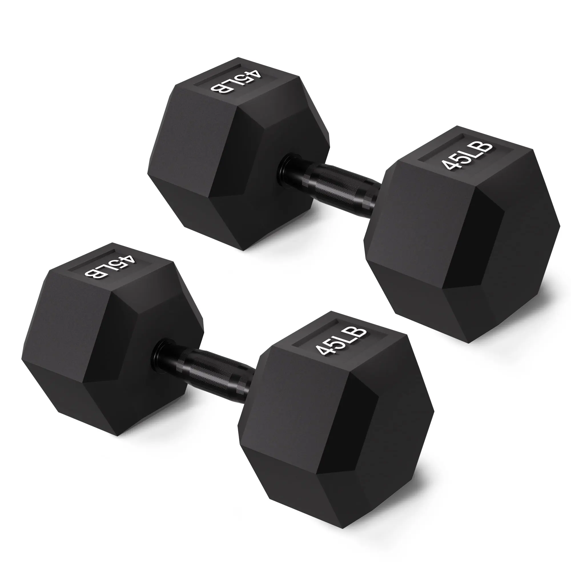 Enhance your home workouts with a hex rubber coated dumbbell set, featuring pairs of 10LB, 45LB, and 50LB weights. These hexagonal dumbbells are designed with a durable rubber coating that protects floors and reduces noise, making them ideal for home gym use.