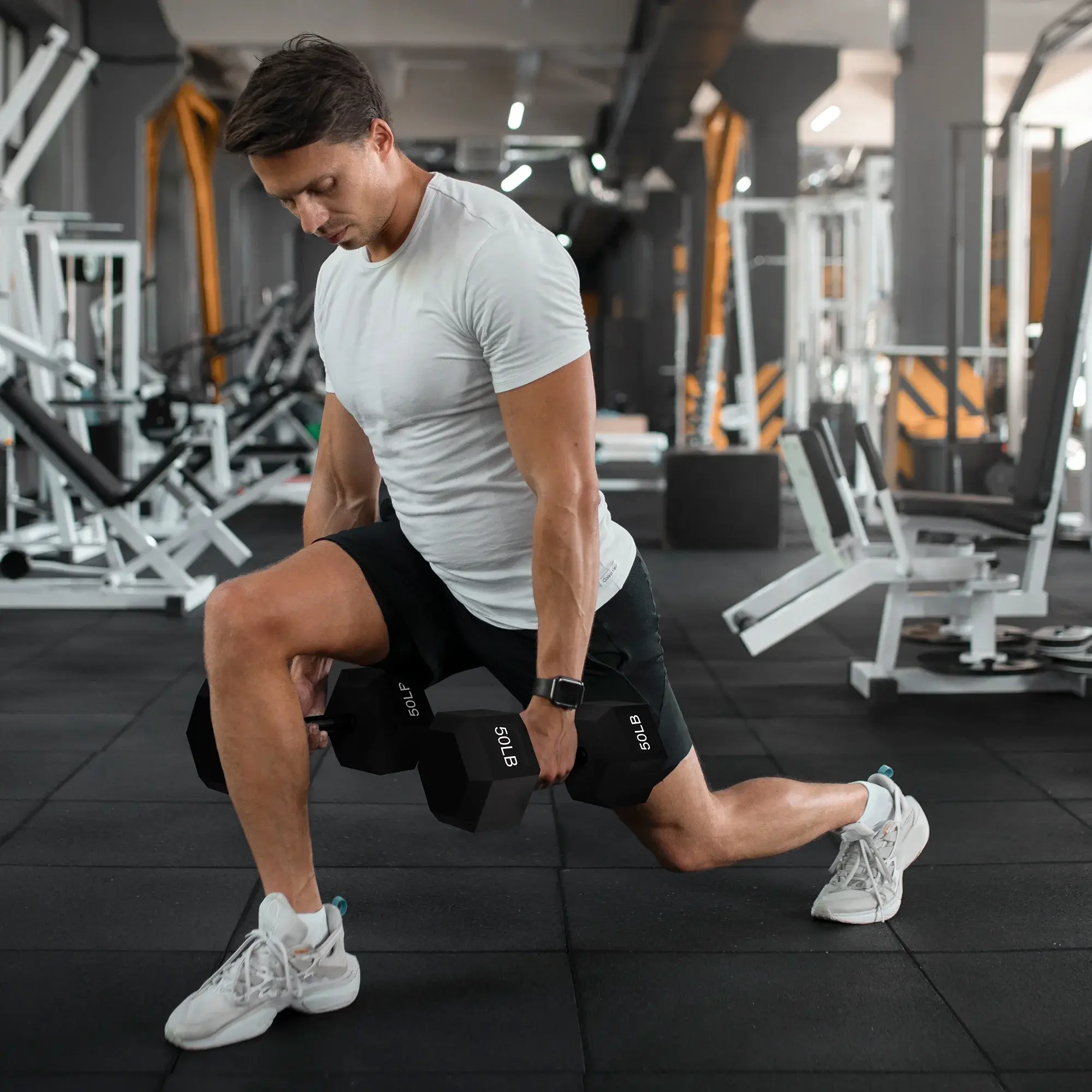 Includes pairs of 10LB, 45LB, and 50LB hex dumbbells to suit a wide range of strength levels and exercises.
