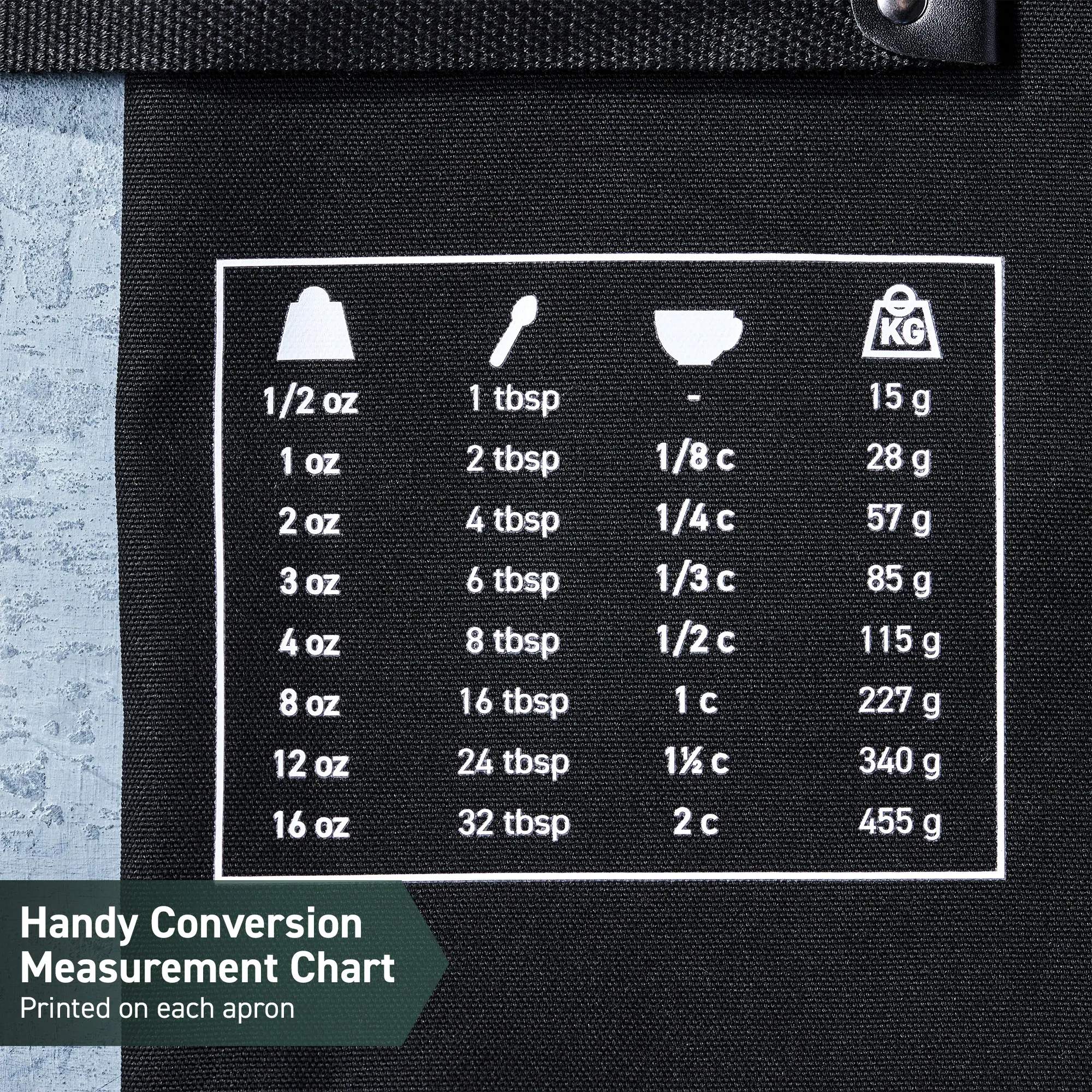 Love the quality of the material. There was a lot of thought into the apron itself. I like the conversion chart on the apron. The towel hanger on the apron helps so you don’t have to search for one. Overall it’s the best apron by far, also it’s eco friendly!