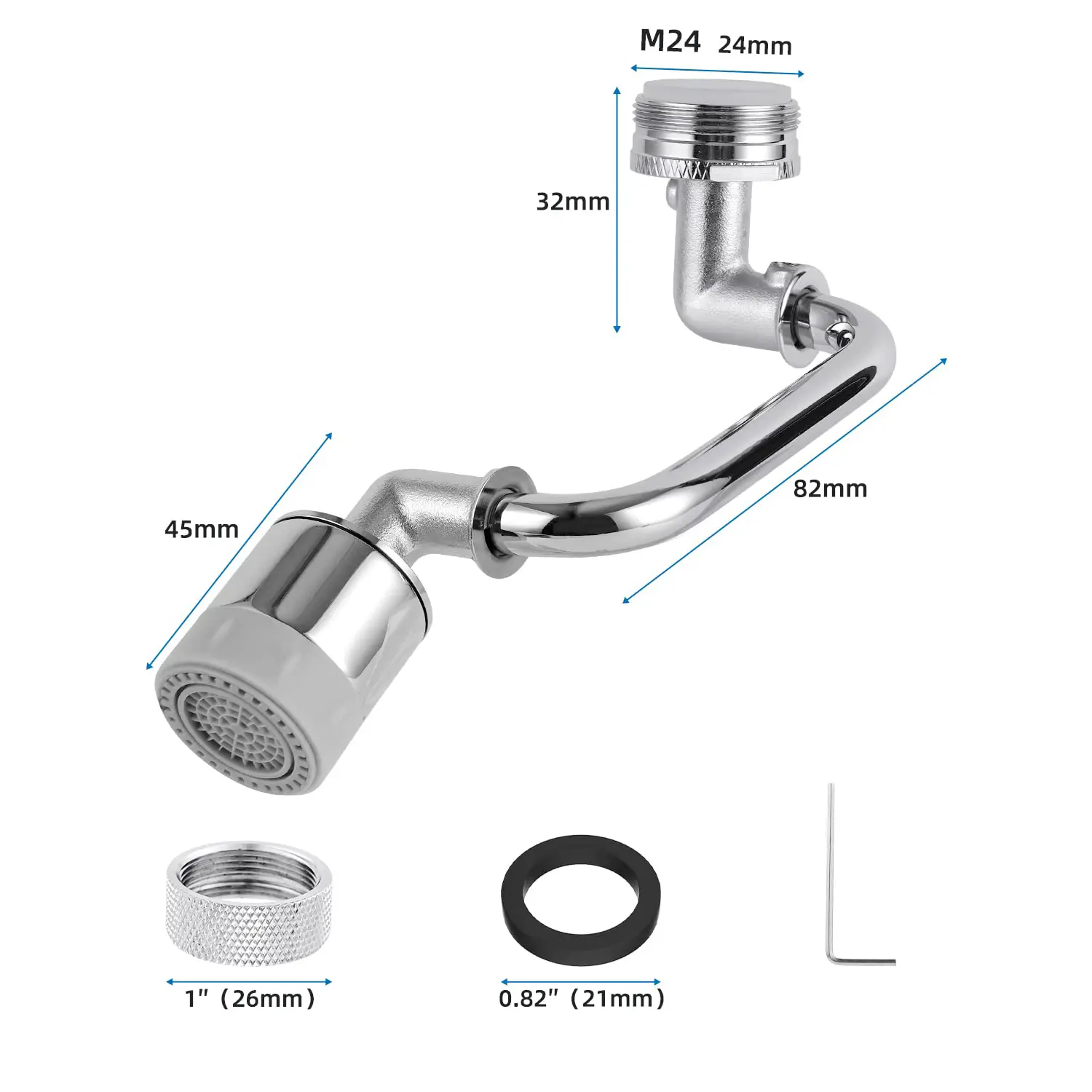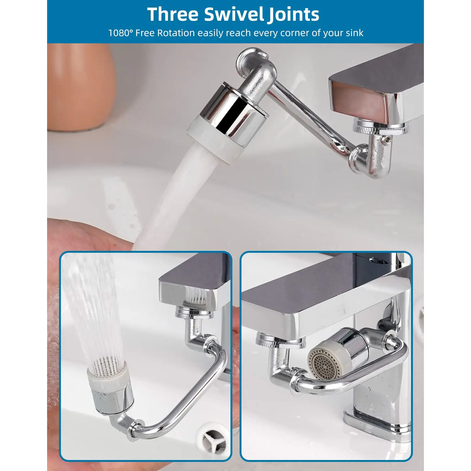 ·【1080° Rotating Faucet Aerator】This universal robotic arm swivel extension faucet aerator has 3 angle-adjustable joints that can be adjusted a total of 1080 degrees in all directions, which can make this faucet extender reach every locations of the sink.